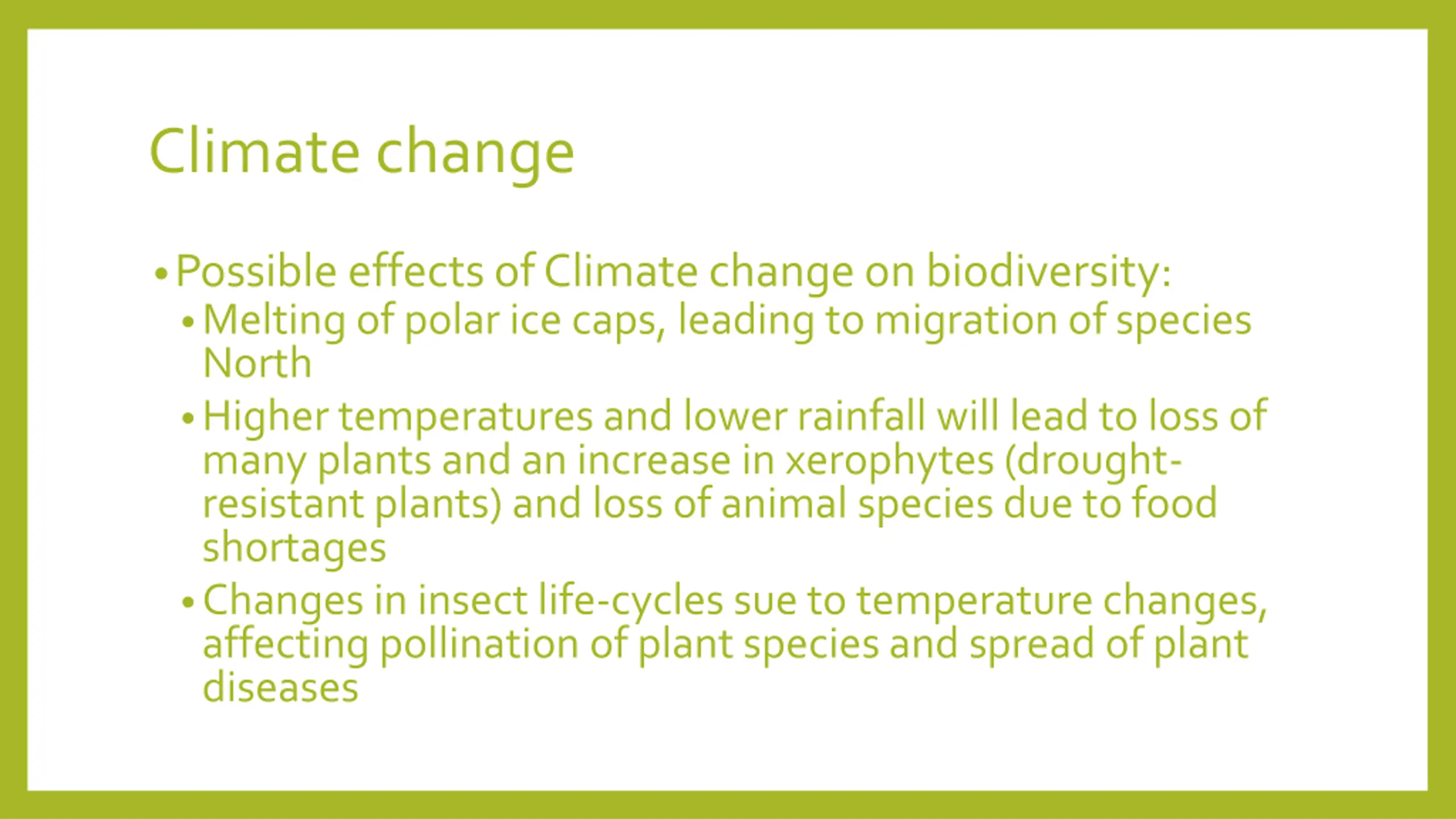 Climate change Possible effects of Climate change on biodiversity: Melting of polar ice caps, leading to migration of species North Higher temperatures and lower rainfall will lead to loss of many plants and an increase in xerophytes (drought- resistant plants) and loss of animal species due to food shortages Changes in insect life-cycles sue to temperature changes, affecting pollination of plant species and spread of plant diseases