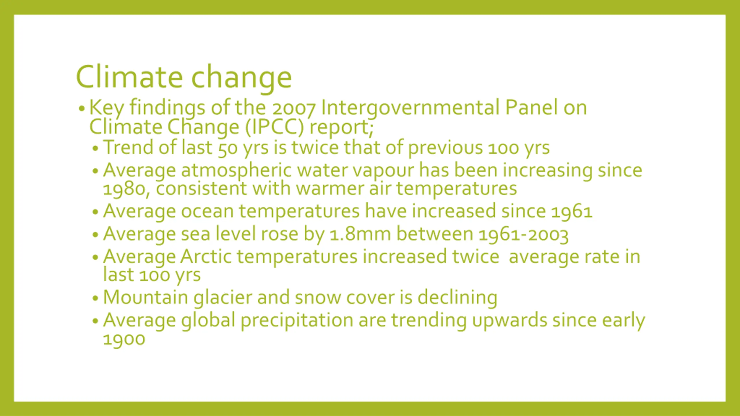 Climate change Key findings of the 2007 Intergovernmental Panel on Climate Change (IPCC) report; Trend of last 50 yrs is twice that of previous 100 yrs Average atmospheric water vapour has been increasing since 1980, consistent with warmer air temperatures Average ocean temperatures have increased since 1961 Average sea level rose by 1.8mm between 1961-2003 Average Arctic temperatures increased twice average rate in last 100 yrs Mountain glacier and snow cover is declining Average global precipitation are trending upwards since early 1900
