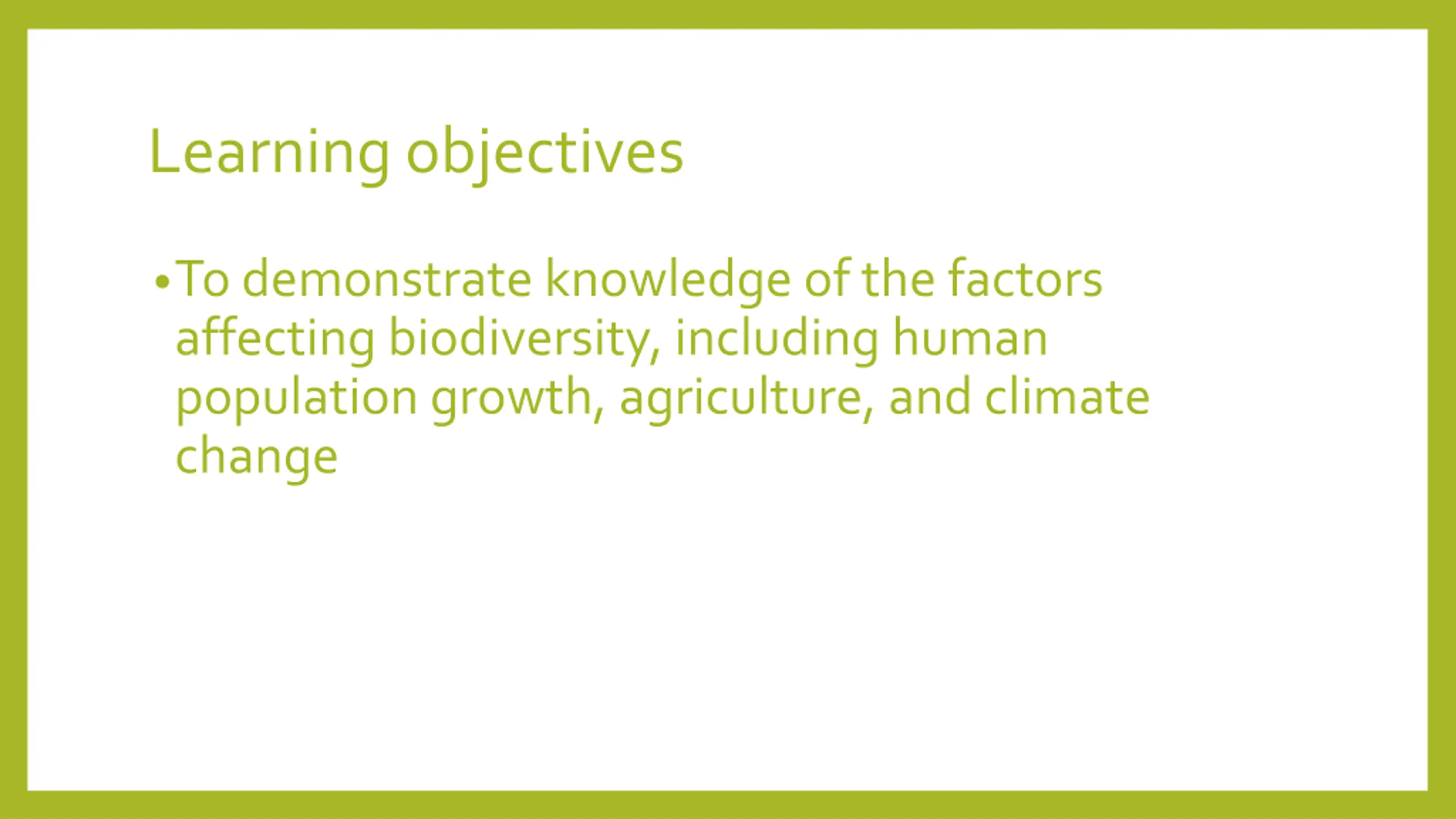 Learning objectives To demonstrate knowledge of the factors affecting biodiversity, including human population growth, agriculture, and climate change