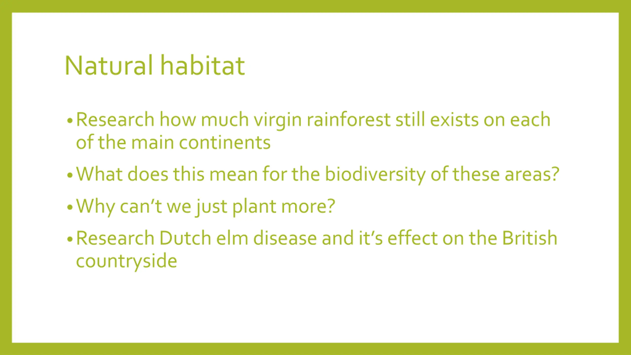 Natural habitat Research how much virgin rainforest still exists on each of the main continents What does this mean for the biodiversity of these areas? Why can t we just plant more? Research Dutch elm disease and it s effect on the British countryside