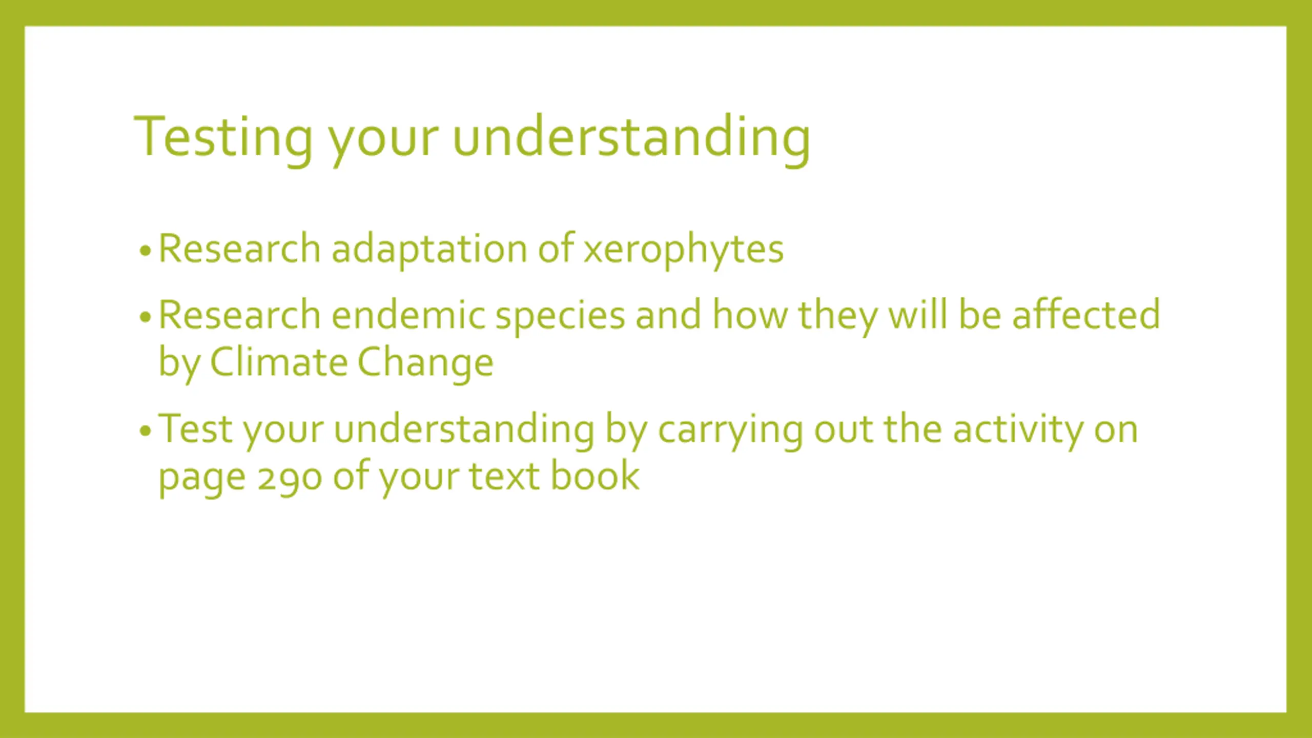 Testing your understanding Research adaptation of xerophytes Research endemic species and how they will be affected by Climate Change Test your understanding by carrying out the activity on page 290 of your text book