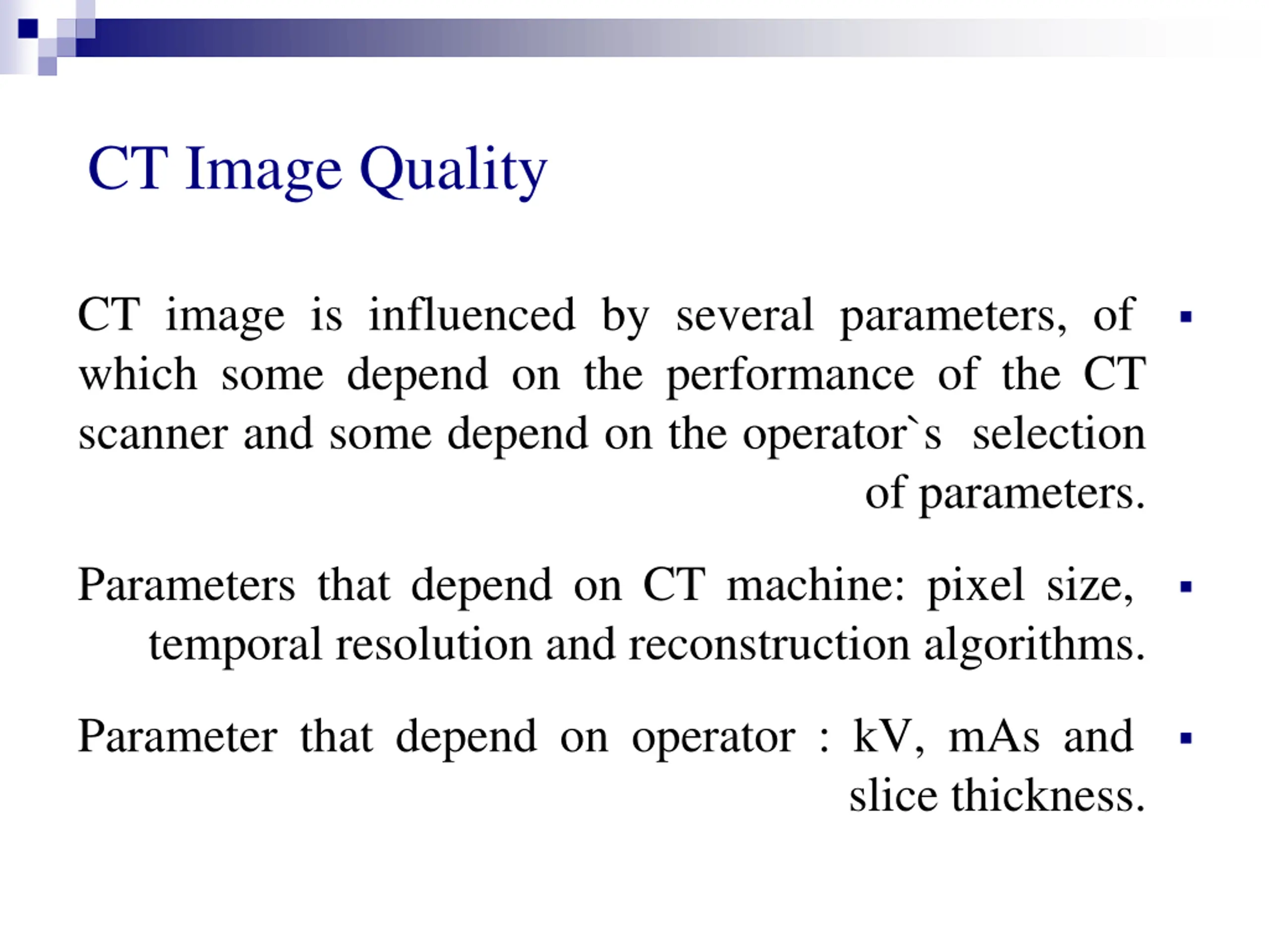 CT Image Quality CT image is influenced by several parameters, of which some depend on the performance of the CT scanner and some depend on the operator`s selection of parameters. Parameters that depend on CT machine: pixel size, temporal resolution and reconstruction algorithms. Parameter that depend on operator : kV, mAs and slice thickness.