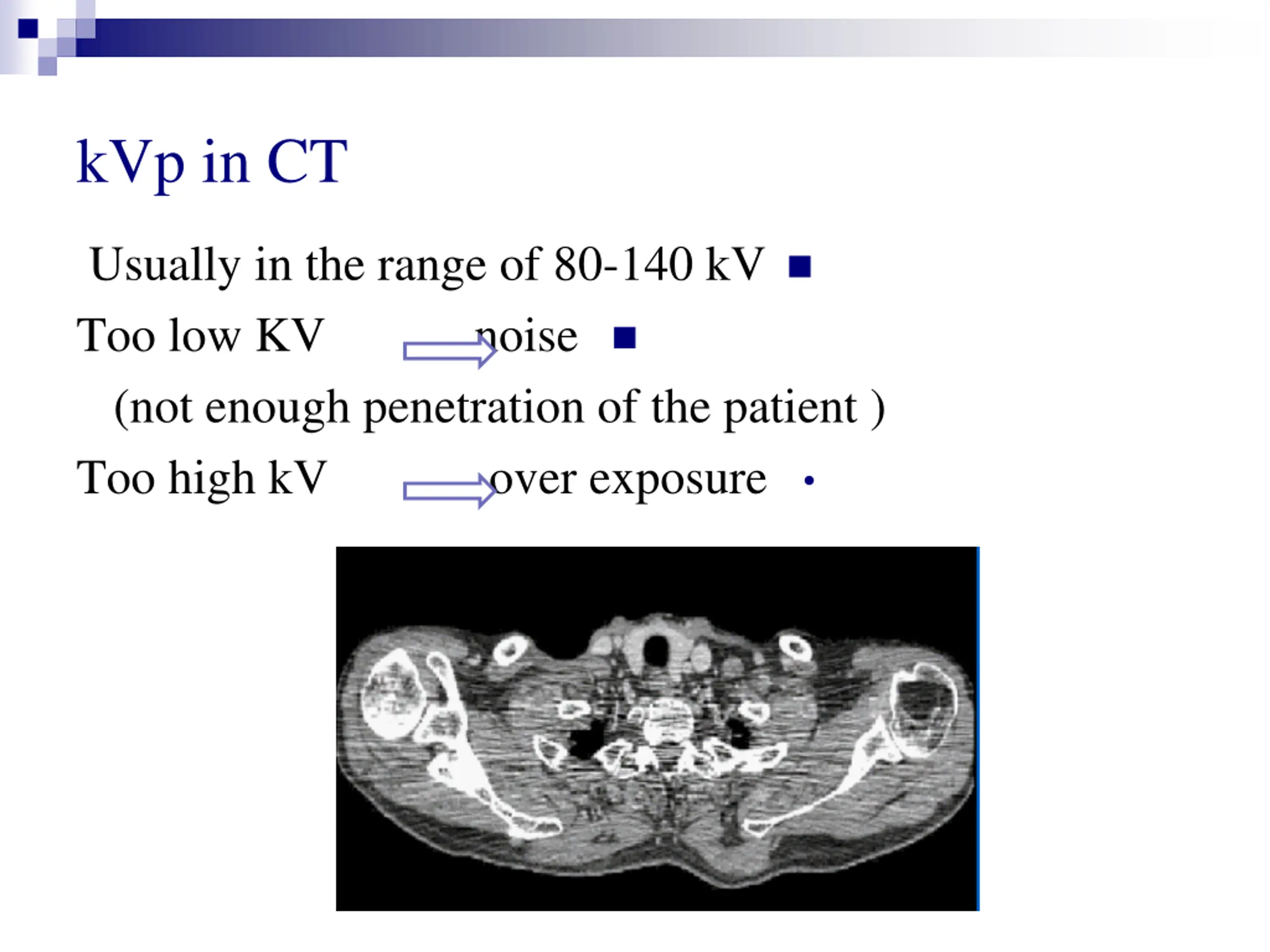 kVp in CT Usually in the range of 80-140 kV Too low KV noise (not enough penetration of the patient ) Too high kV over exposure