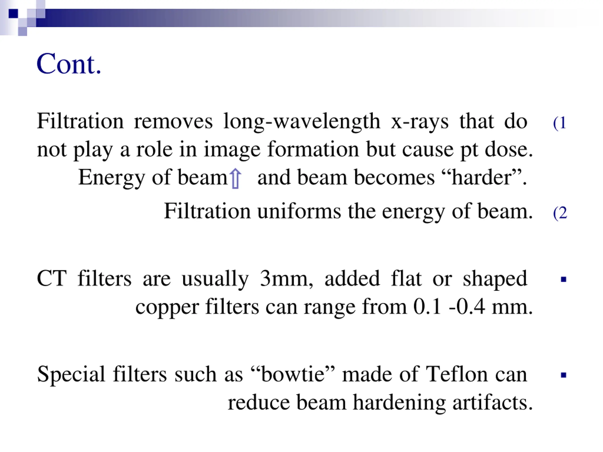 Cont. Filtration removes long-wavelength x-rays that do not play a role in image formation but cause pt dose. Energy of beam and beam becomes harder . Filtration uniforms the energy of beam. (1 (2 CT filters are usually 3mm, added flat or shaped copper filters can range from 0.1 -0.4 mm. Special filters such as bowtie made of Teflon can reduce beam hardening artifacts.