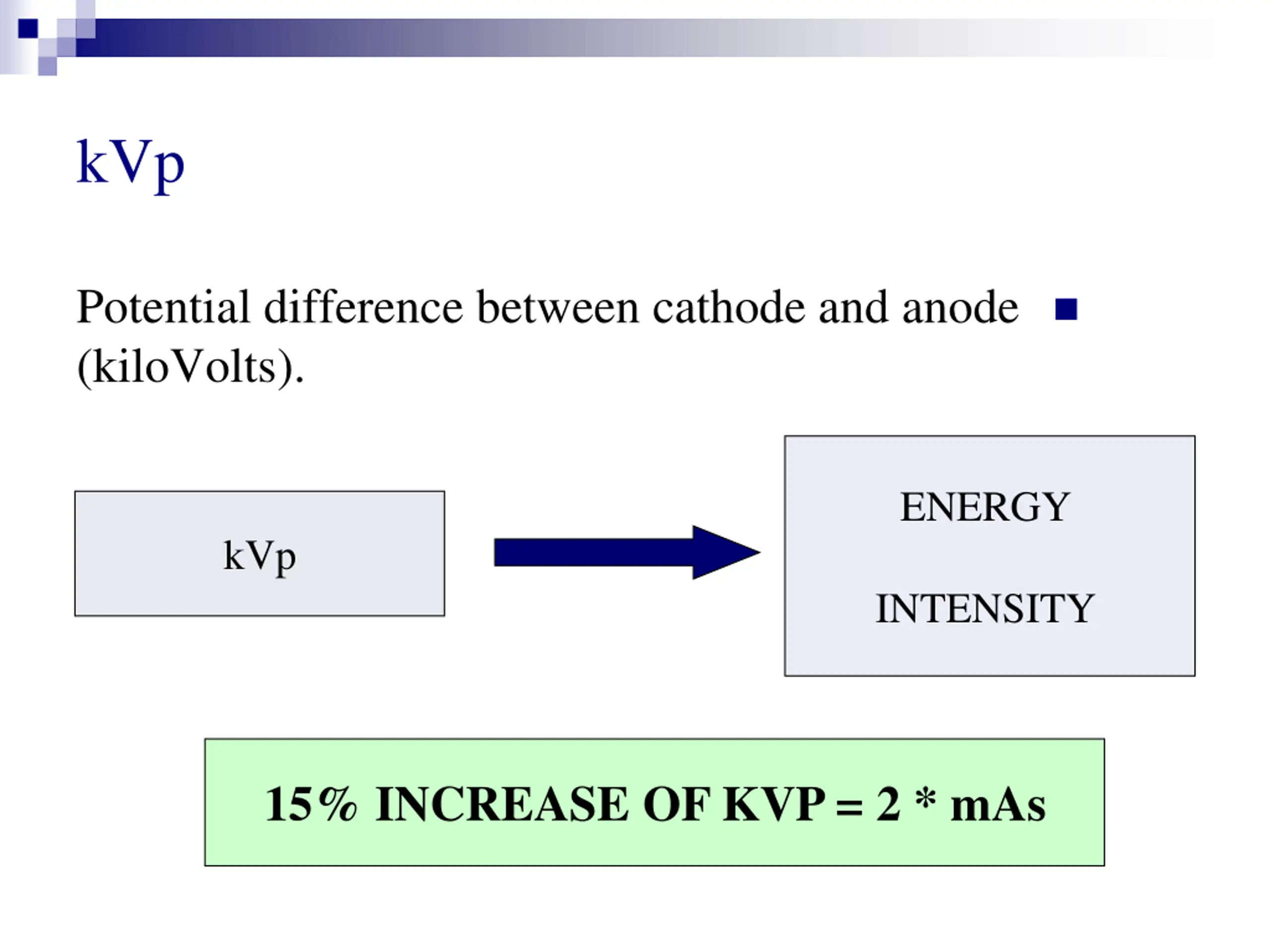kVp Potential difference between cathode and anode (kiloVolts). ENERGY kVp INTENSITY 15% INCREASE OF KVP = 2 * mAs