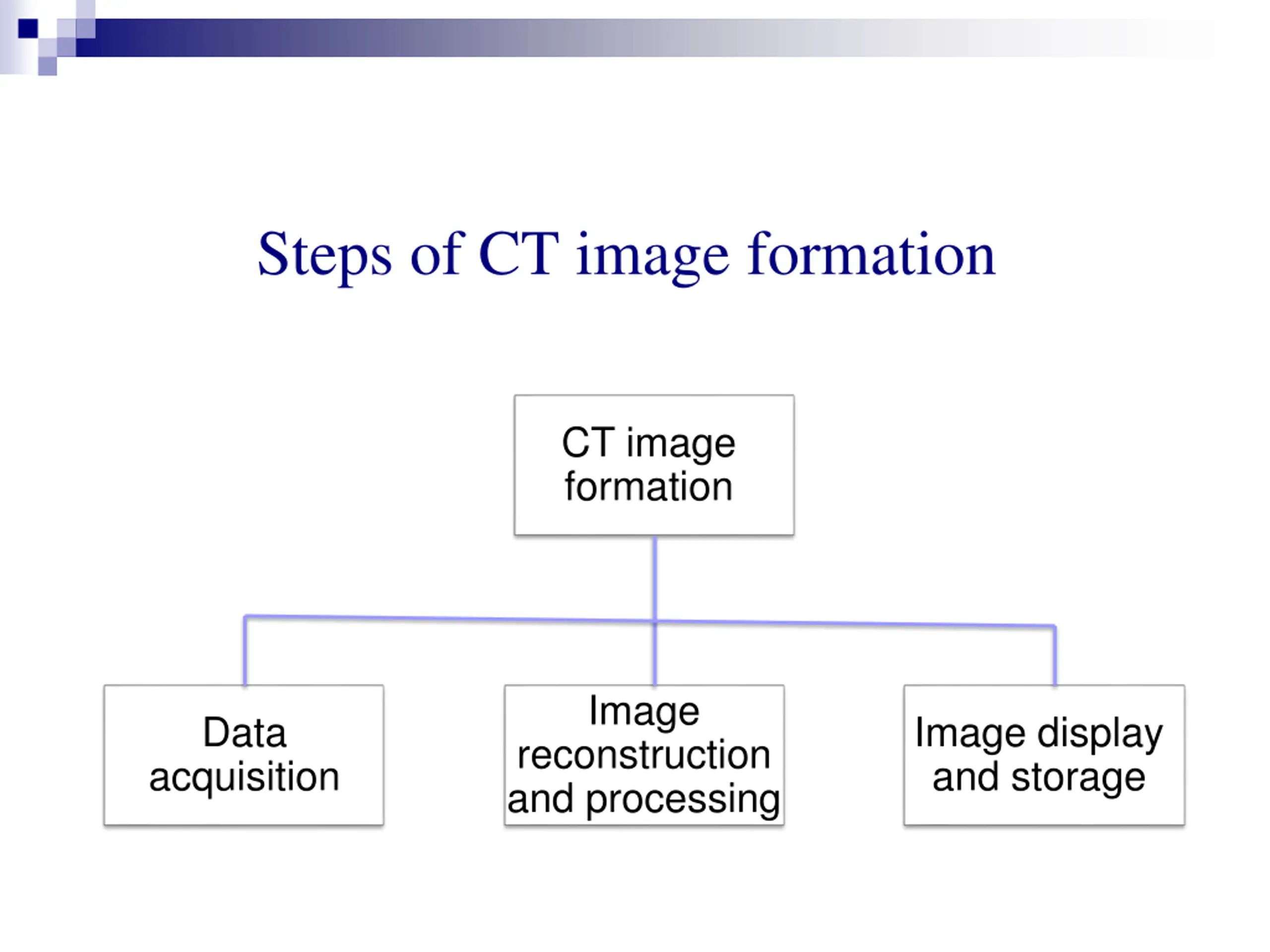 Steps of CT image formation CT image formation Image Data Image display and storage reconstruction and processing acquisition