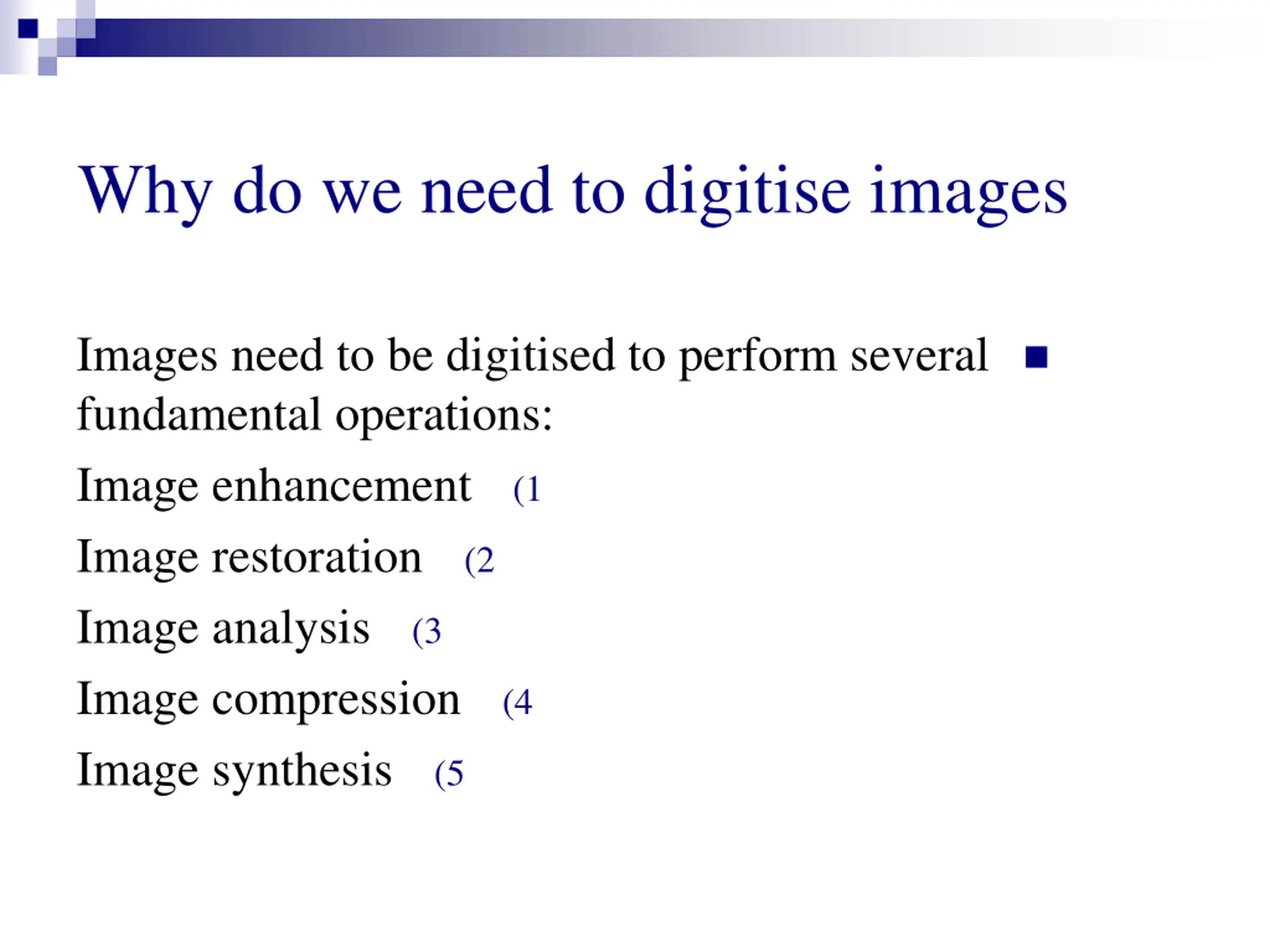 Why do we need to digitise images Images need to be digitised to perform several fundamental operations: Image enhancement Image restoration Image analysis Image compression Image synthesis (1 (2 (3 (4 (5
