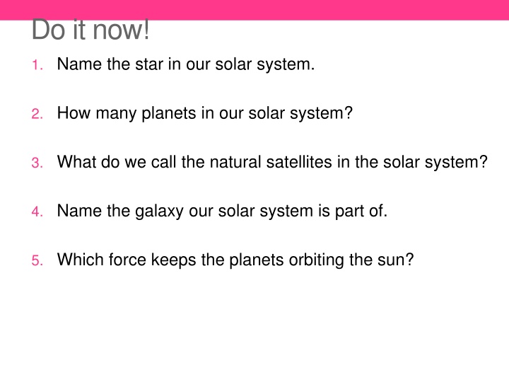 Do it now! 1. Name the star in our solar system. 2. How many planets in our solar system? 3. What do we call the natural satellites in the solar system? 4. Name the galaxy our solar system is part of. 5. Which force keeps the planets orbiting the sun?