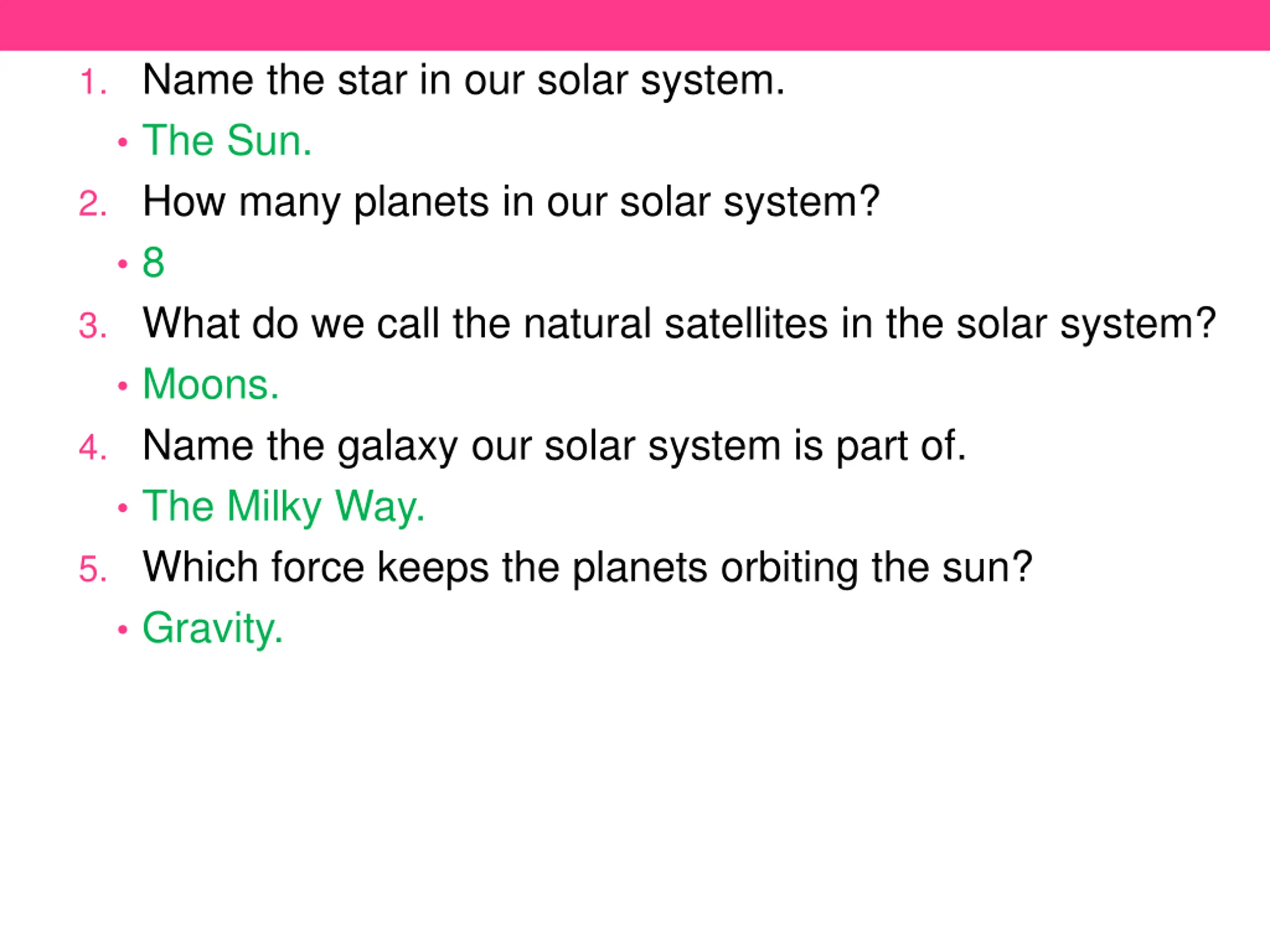 1. Name the star in our solar system. The Sun. 2. How many planets in our solar system? 8 3. What do we call the natural satellites in the solar system? Moons. 4. Name the galaxy our solar system is part of. The Milky Way. 5. Which force keeps the planets orbiting the sun? Gravity.