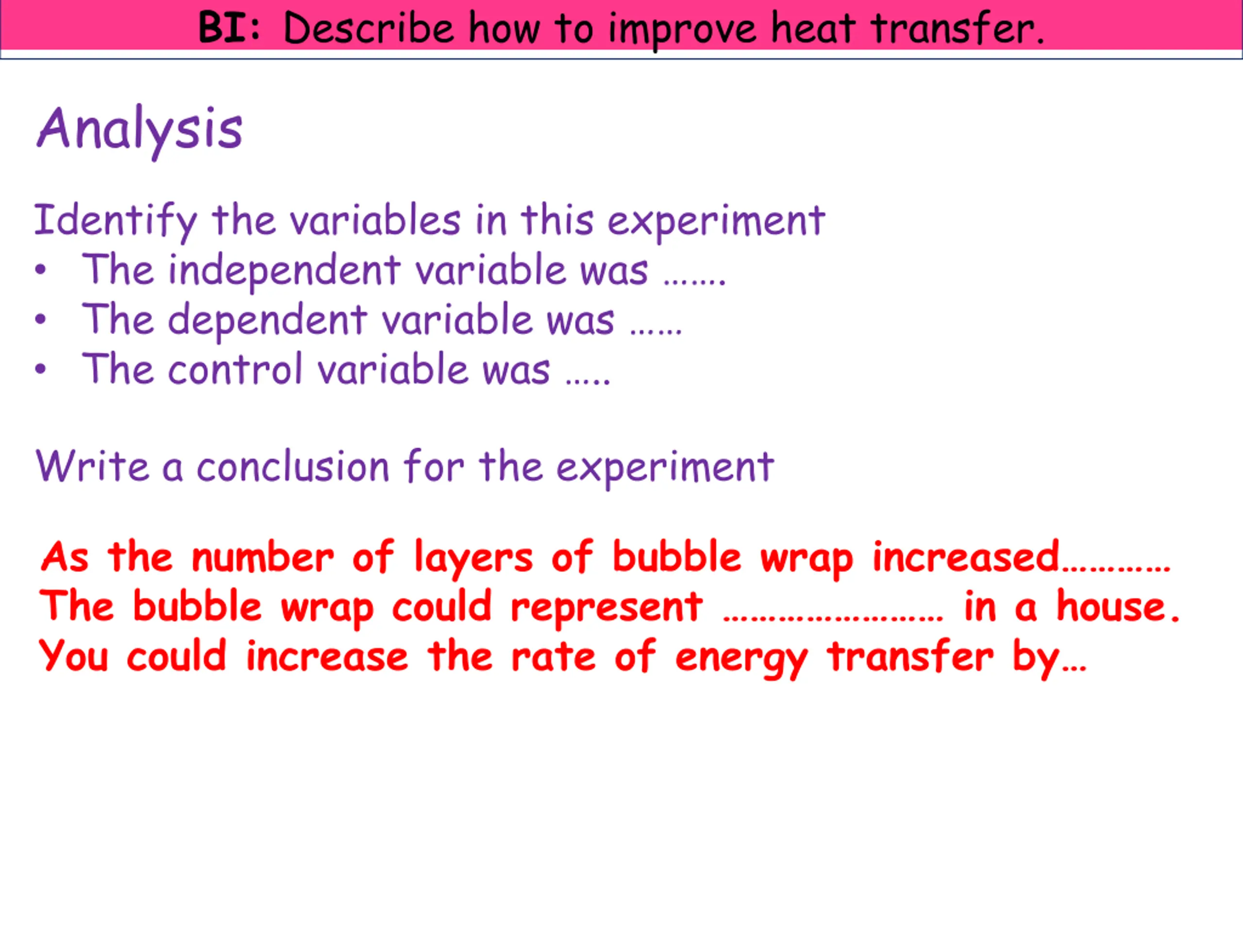 BI: Describe how to improve heat transfer. Analysis Identify the variables in this experiment The independent variable was . The dependent variable was The control variable was .. Write a conclusion for the experiment As the number of layers of bubble wrap increased The bubble wrap could represent in a house. You could increase the rate of energy transfer by