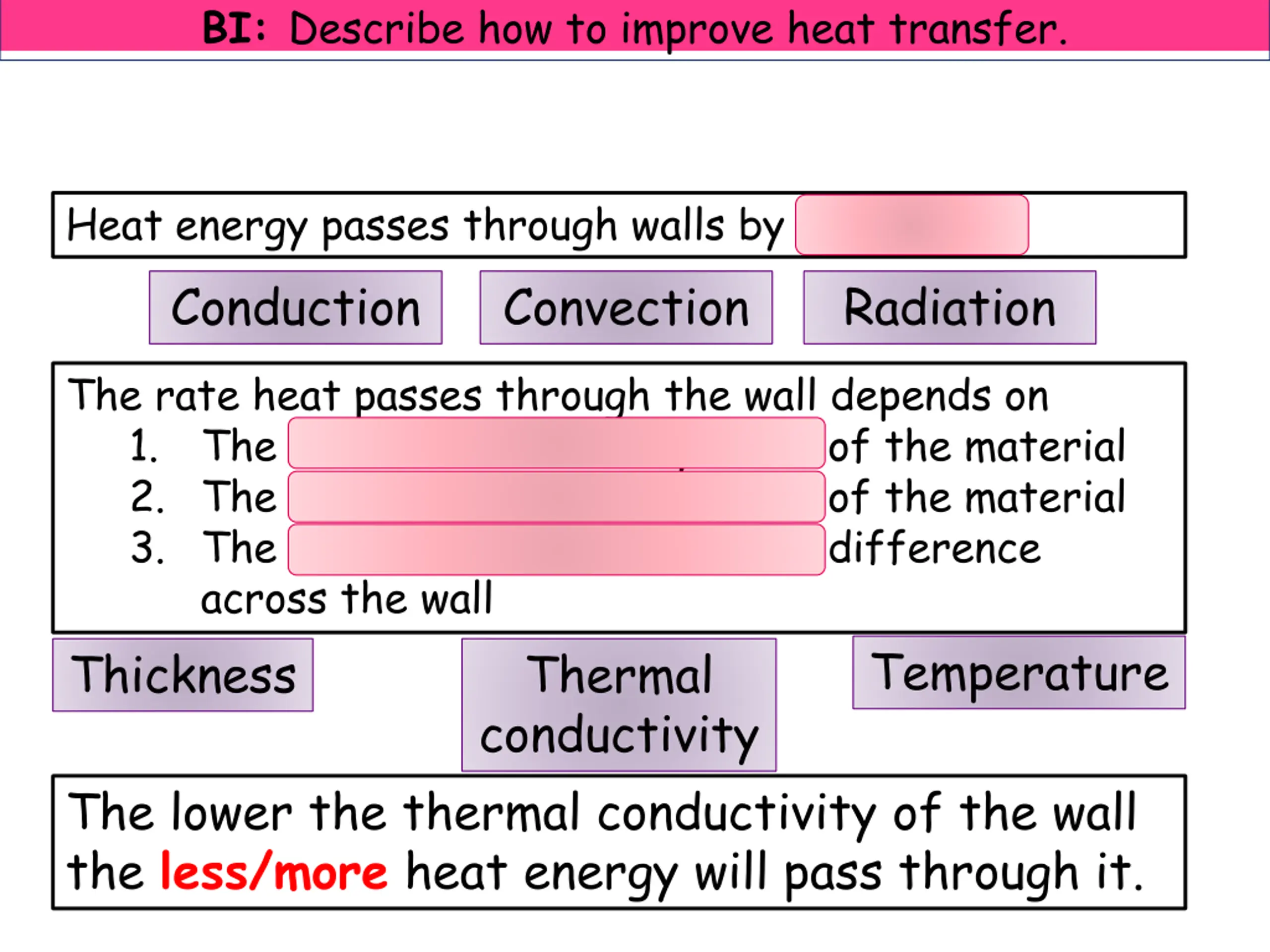 BI: Describe how to improve heat transfer. Heat energy passes through walls by conduction Conduction Convection Radiation The rate heat passes through the wall depends on 1. The thermal conductivity 2. The thickness 3. The temperature across the wall Thermal conductivity of the material of the material difference Temperature Thickness The lower the thermal conductivity of the wall the less/more heat energy will pass through it.