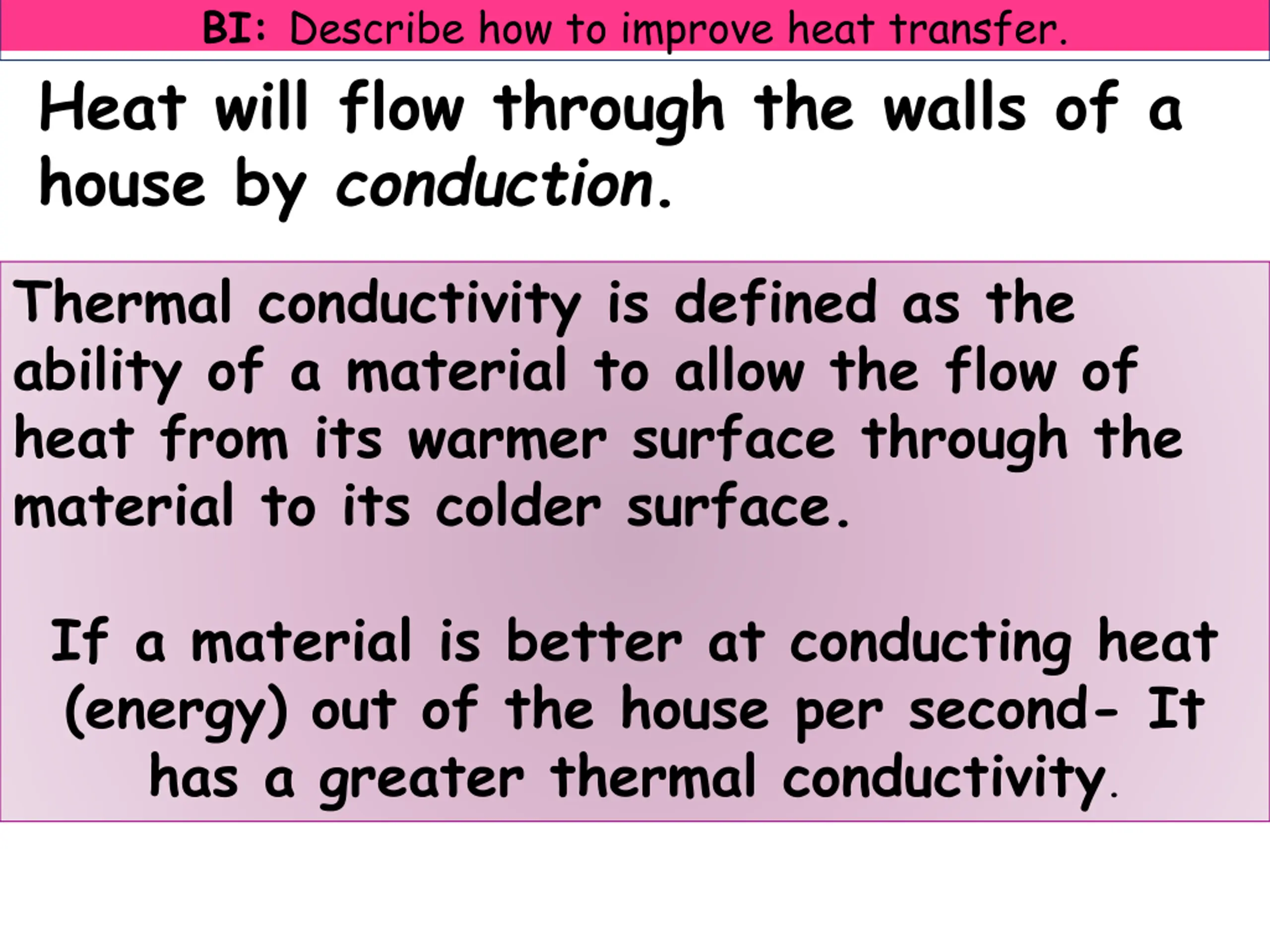 BI: Describe how to improve heat transfer. Heat will flow through the walls of a house by conduction. Thermal conductivity is defined as the ability of a material to allow the flow of heat from its warmer surface through the material to its colder surface. If a material is better at conducting heat (energy) out of the house per second- It has a greater thermal conductivity.