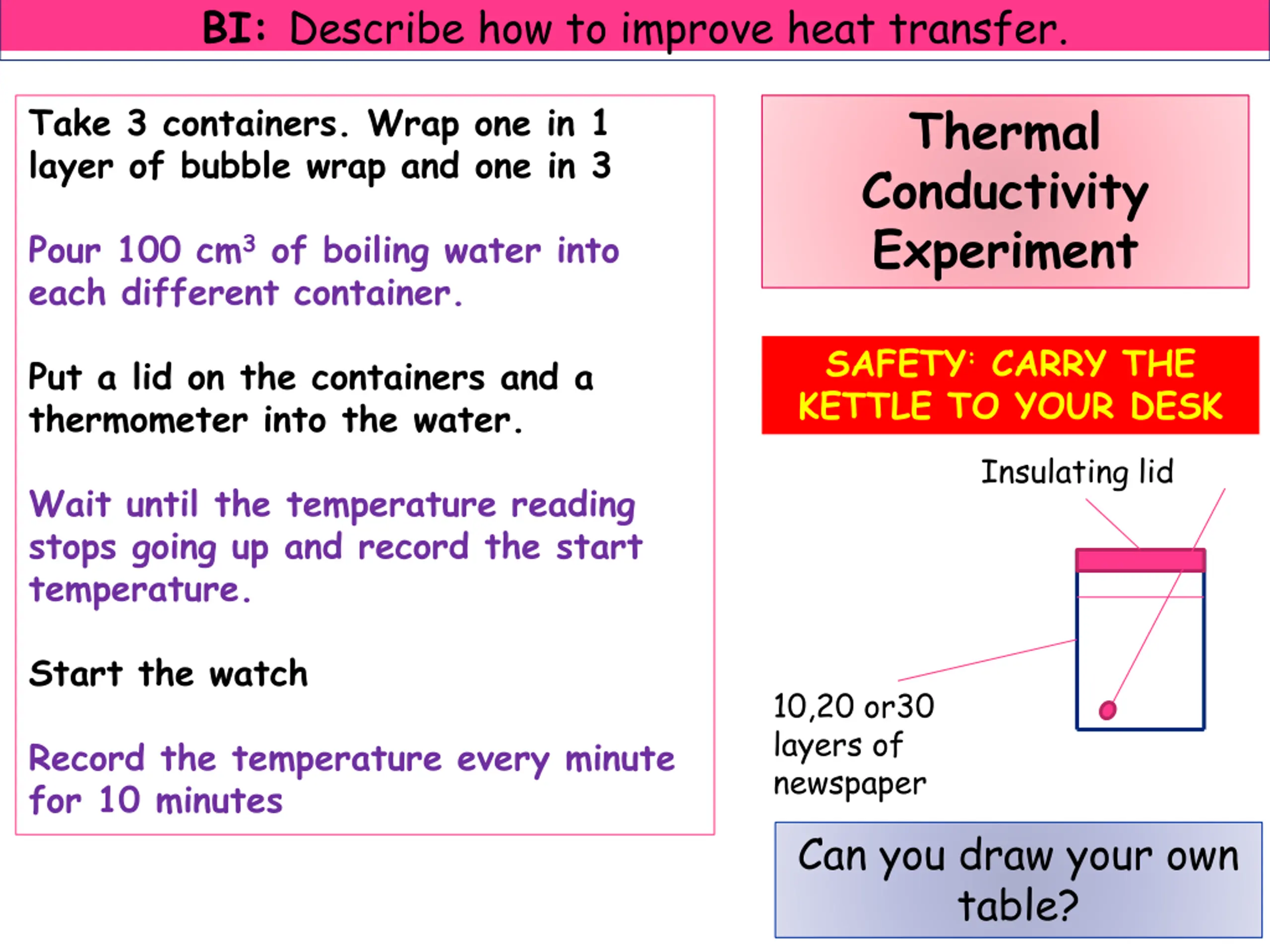 BI: Describe how to improve heat transfer. Thermal Conductivity Experiment Take 3 containers. Wrap one in 1 layer of bubble wrap and one in 3 Pour 100 cm3 of boiling water into each different container. SAFETY: CARRY THE KETTLE TO YOUR DESK Put a lid on the containers and a thermometer into the water. Insulating lid Wait until the temperature reading stops going up and record the start temperature. Start the watch 10,20 or30 layers of newspaper Can you draw your own table? Record the temperature every minute for 10 minutes