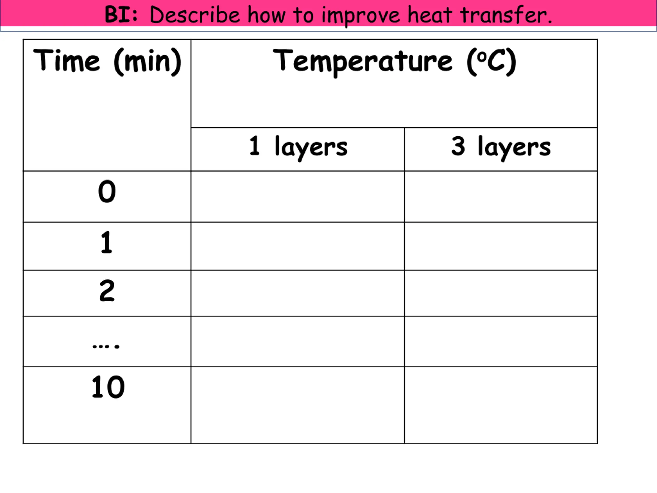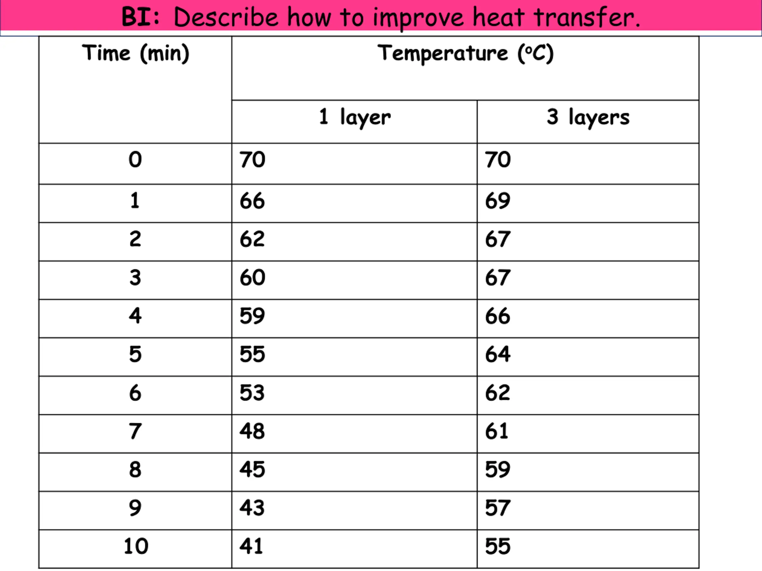 BI: Describe how to improve heat transfer. Time (min) Temperature (oC) 1 layer 3 layers 0 70 70 1 2 3 4 5 6 7 8 9 10 66 62 60 59 55 53 48 45 43 41 69 67 67 66 64 62 61 59 57 55