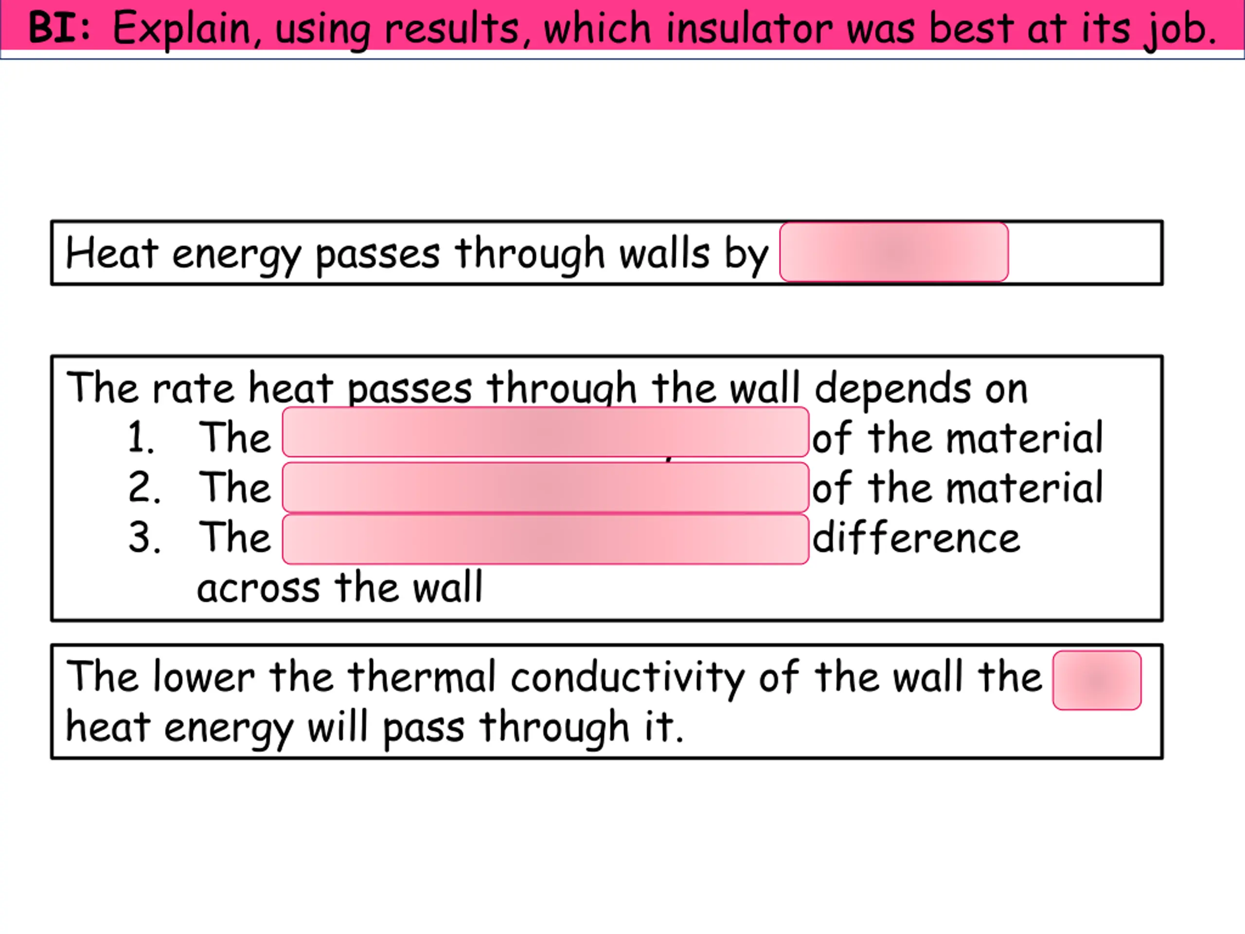 BI: Explain, using results, which insulator was best at its job. Heat energy passes through walls by conduction The rate heat passes through the wall depends on 1. The thermal conductivity 2. The thickness 3. The temperature across the wall of the material of the material difference The lower the thermal conductivity of the wall the less heat energy will pass through it.