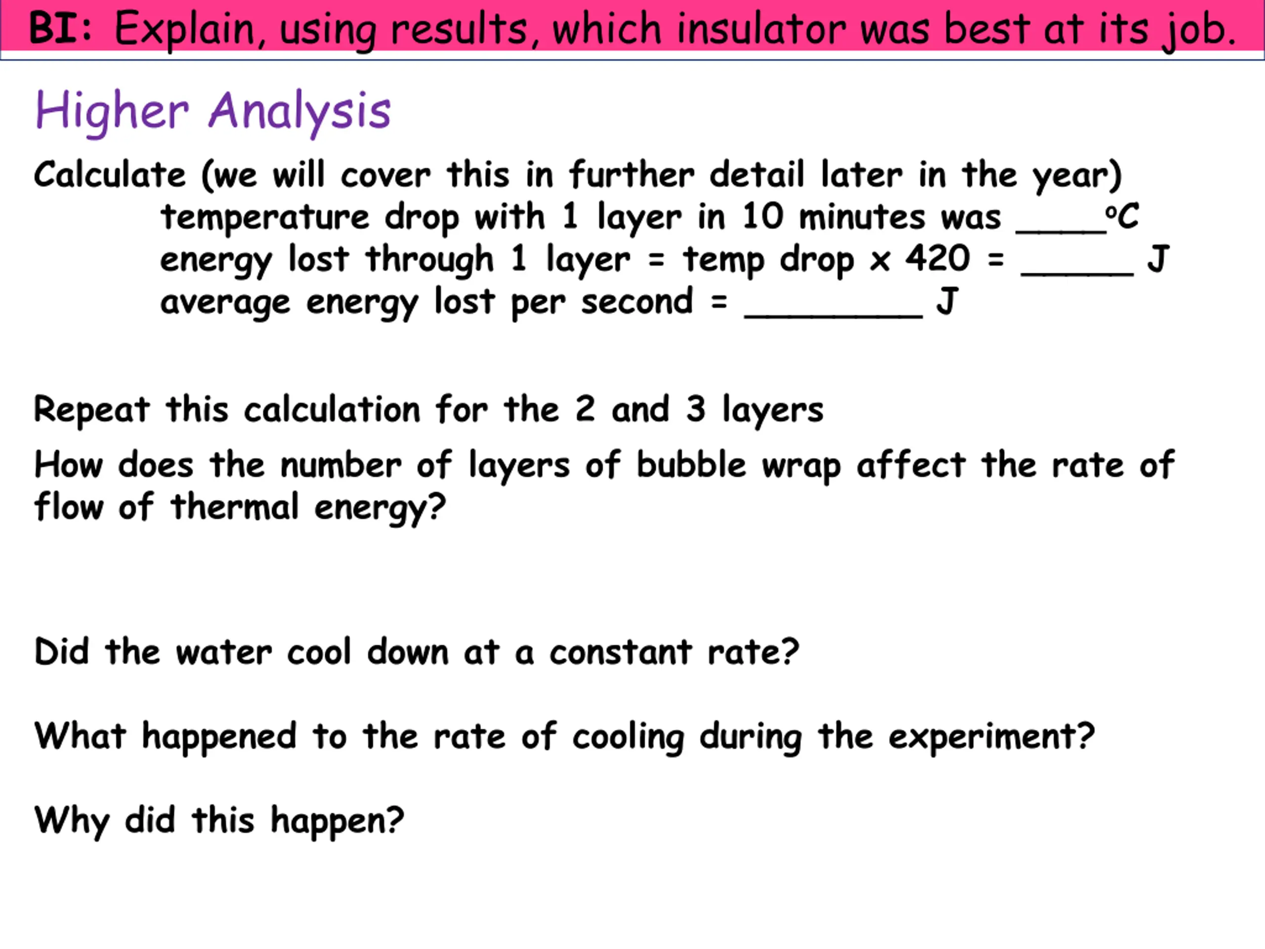 BI: Explain, using results, which insulator was best at its job. Higher Analysis Calculate (we will cover this in further detail later in the year) temperature drop with 1 layer in 10 minutes was ____oC energy lost through 1 layer = temp drop x 420 = _____ J average energy lost per second = ________ J Repeat this calculation for the 2 and 3 layers How does the number of layers of bubble wrap affect the rate of flow of thermal energy? Did the water cool down at a constant rate? What happened to the rate of cooling during the experiment? Why did this happen?