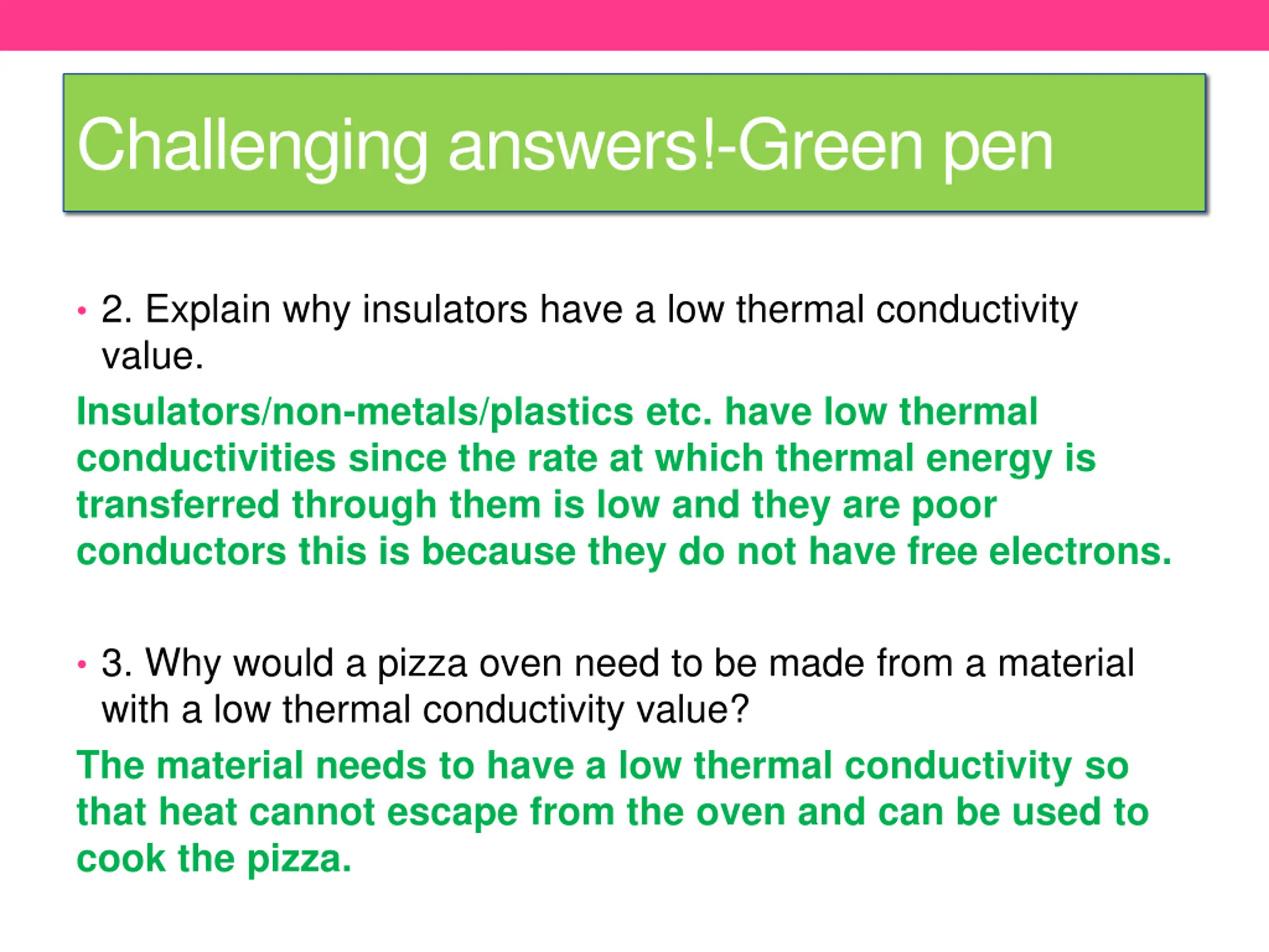 Challenging answers!-Green pen 2. Explain why insulators have a low thermal conductivity value. Insulators/non-metals/plastics etc. have low thermal conductivities since the rate at which thermal energy is transferred through them is low and they are poor conductors this is because they do not have free electrons. 3. Why would a pizza oven need to be made from a material with a low thermal conductivity value? The material needs to have a low thermal conductivity so that heat cannot escape from the oven and can be used to cook the pizza.
