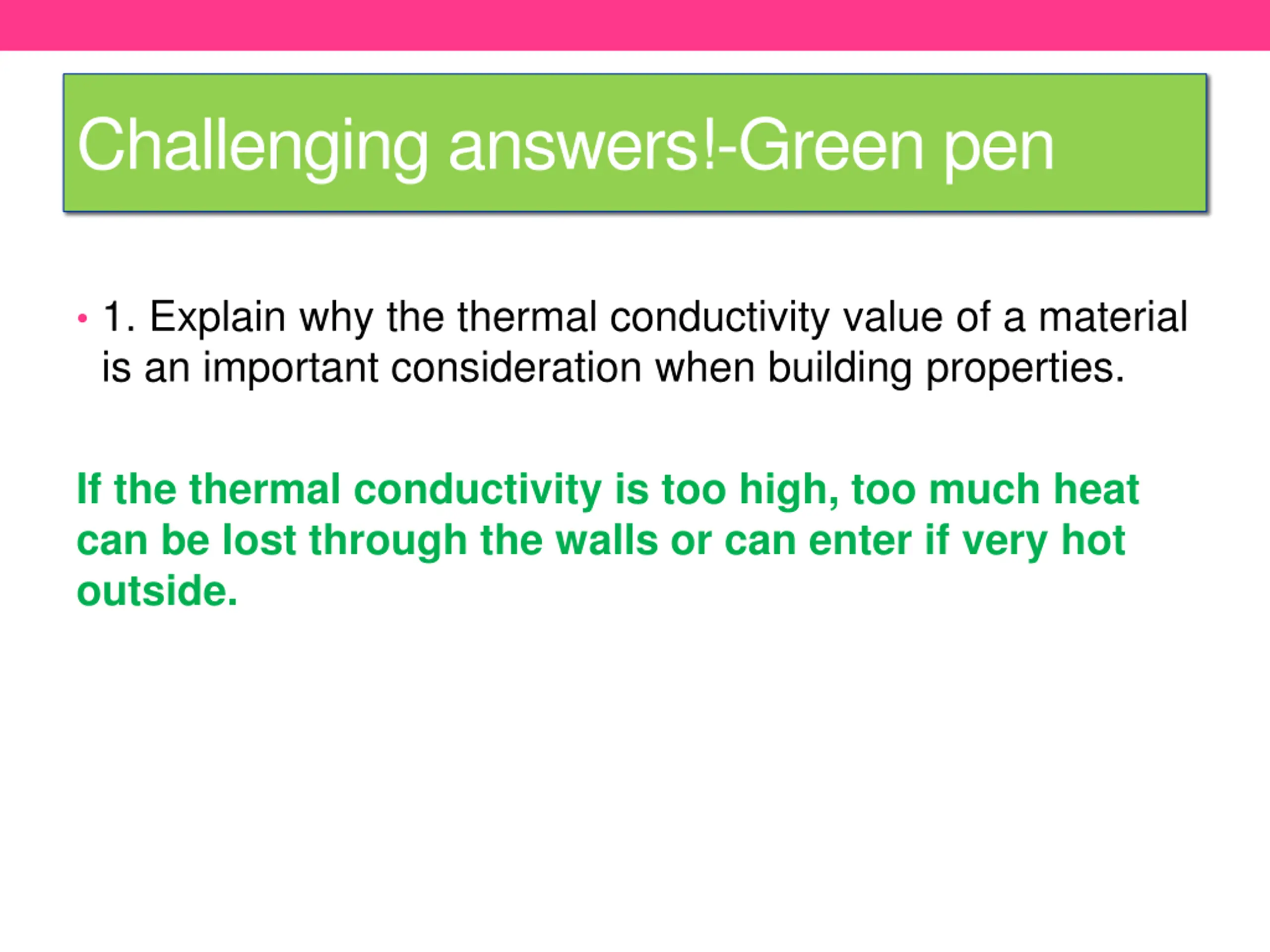 Challenging answers!-Green pen 1. Explain why the thermal conductivity value of a material is an important consideration when building properties. If the thermal conductivity is too high, too much heat can be lost through the walls or can enter if very hot outside.