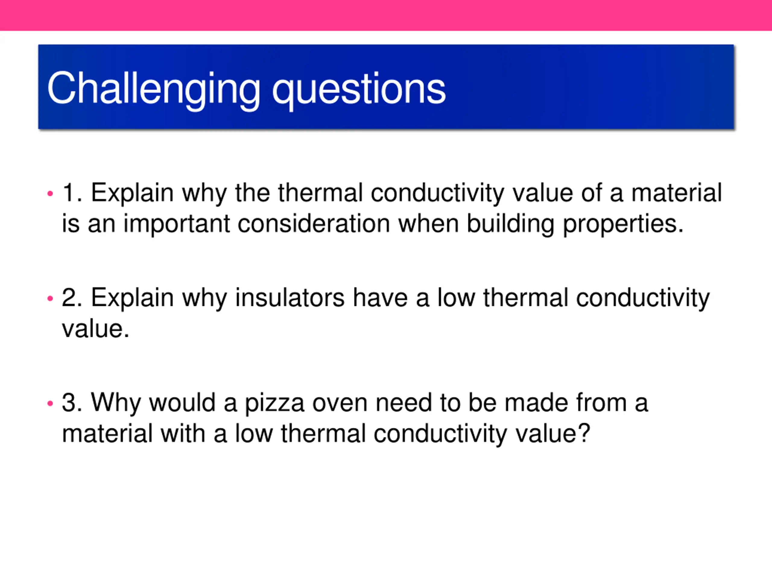 Challenging questions 1. Explain why the thermal conductivity value of a material is an important consideration when building properties. 2. Explain why insulators have a low thermal conductivity value. 3. Why would a pizza oven need to be made from a material with a low thermal conductivity value?