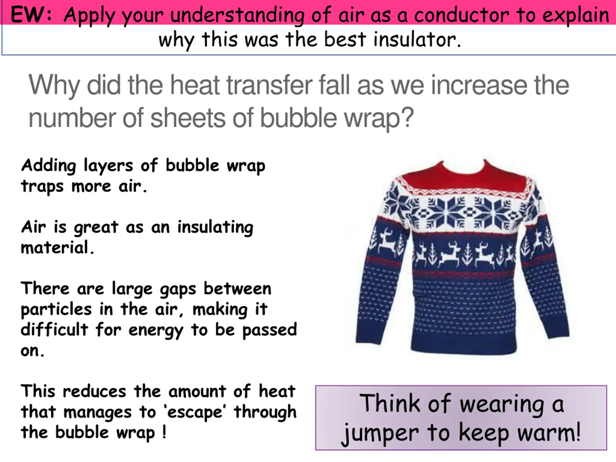 EW: Apply your understanding of air as a conductor to explain why this was the best insulator. Why did the heat transfer fall as we increase the number of sheets of bubble wrap? http://tse1.mm.bing.net/th?id=OIP.Ma2ab94b1a7e9b5eabb716fbd7c1ec3d9H0w=300h=286c=0pid=1.9rs=0p=0r=0 Adding layers of bubble wrap traps more air. Air is great as an insulating material. There are large gaps between particles in the air, making it difficult for energy to be passed on. This reduces the amount of heat that manages to escape through the bubble wrap ! Think of wearing a jumper to keep warm!