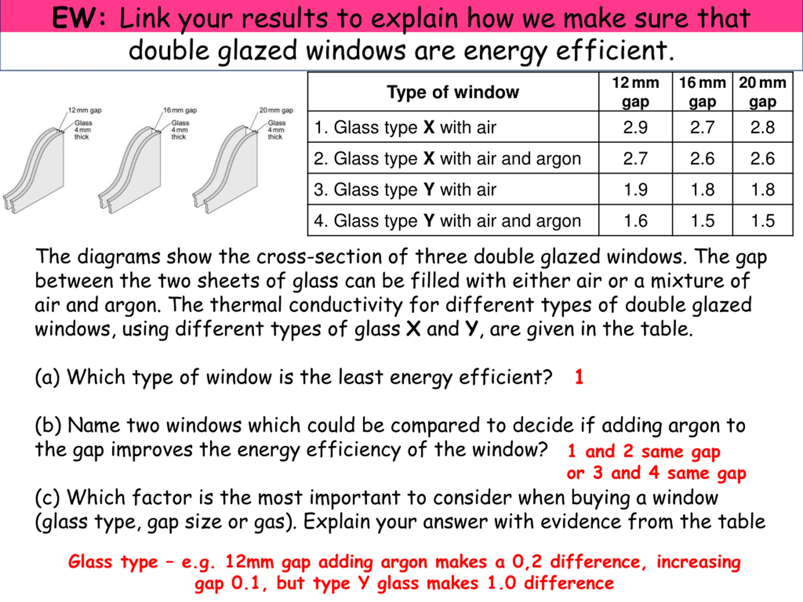 EW: Link your results to explain how we make sure that double glazed windows are energy efficient. 12mm gap 2.9 16mm gap 2.7 20mm gap 2.8 Type of window 1. Glass type X with air 2. Glass type X with air and argon 2.7 2.6 2.6 3. Glass type Y with air 1.9 1.8 1.8 4. Glass type Y with air and argon 1.6 1.5 1.5 The diagrams show the cross-section of three double glazed windows. The gap between the two sheets of glass can be filled with either air or a mixture of air and argon. The thermal conductivity for different types of double glazed windows, using different types of glass X and Y, are given in the table. (a) Which type of window is the least energy efficient? 1 (b) Name two windows which could be compared to decide if adding argon to the gap improves the energy efficiency of the window? 1 and 2 same gap or 3 and 4 same gap (c) Which factor is the most important to consider when buying a window (glass type, gap size or gas). Explain your answer with evidence from the table Glass type e.g. 12mm gap adding argon makes a 0,2 difference, increasing gap 0.1, but type Y glass makes 1.0 difference