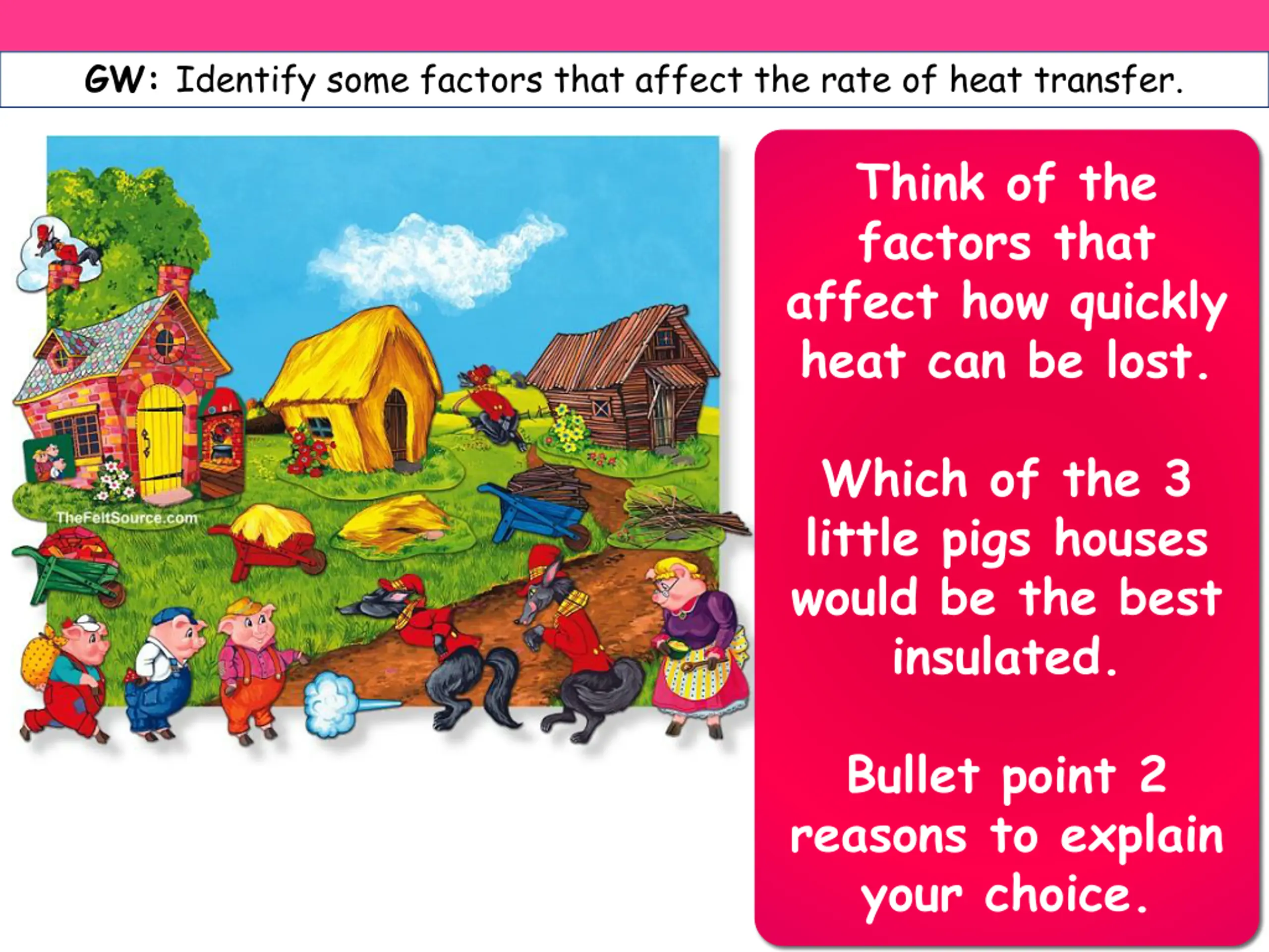 GW: Identify some factors that affect the rate of heat transfer. Think of the factors that affect how quickly heat can be lost. Which of the 3 little pigs houses would be the best insulated. Bullet point 2 reasons to explain your choice.