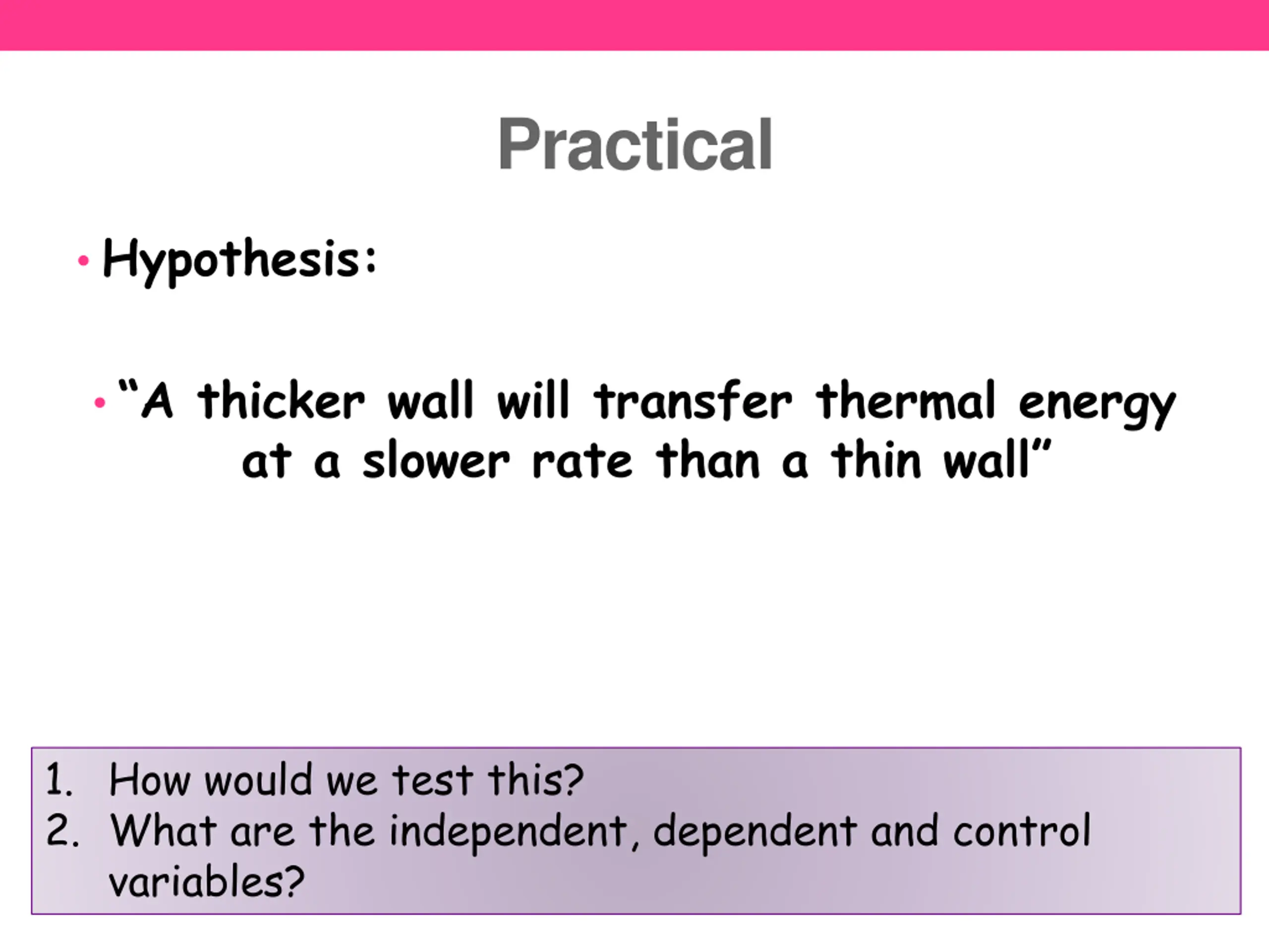 Practical Hypothesis: A thicker wall will transfer thermal energy at a slower rate than a thin wall 1. How would we test this? 2. What are the independent, dependent and control variables?