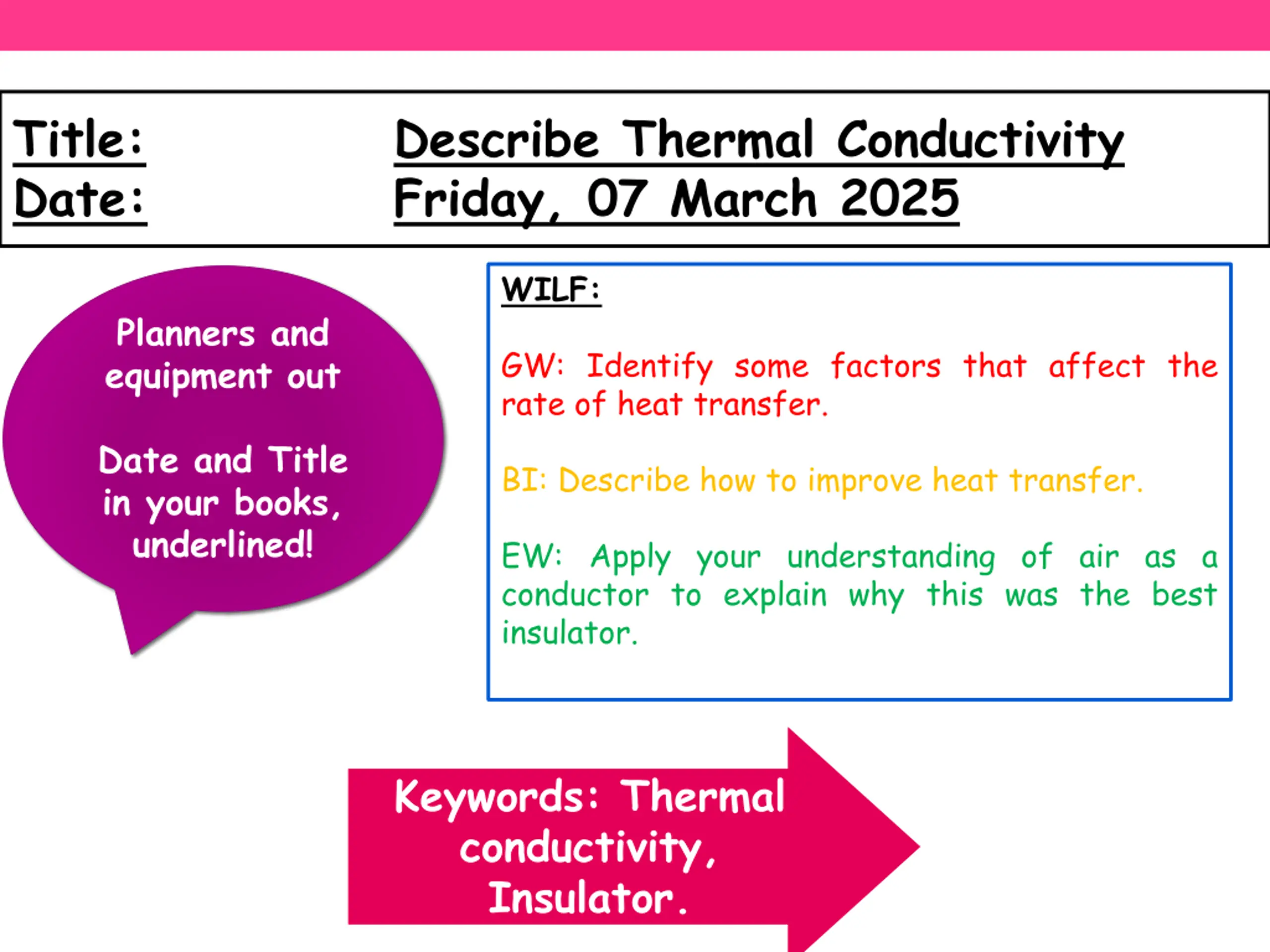 Title: Date: Describe Thermal Conductivity Friday, 07 March 2025 WILF: Planners and equipment out GW: Identify some factors that affect the rate of heat transfer. Date and Title in your books, underlined! BI: Describe how to improve heat transfer. EW: Apply your understanding of air as a conductor to explain why this was the best insulator. Keywords: Thermal conductivity, Insulator.