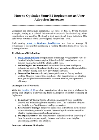 Public sector organizations are increasingly investing in Business Intelligence Solutions (BIS) to leverage data for decision-making. This study by Modiketse Tshehla explores the factors affecting BIS adoption, incorporating concepts like assimilation, adoption, diffusion, and infusion. Through research methodology including interpretivism and case studies, the study investigates the Technology-Organisation-Environment framework to understand the impact on BIS adoption. Key findings highlight the importance of factors like decision enhancement, expected benefits, and organizational acceptance in the adoption process.