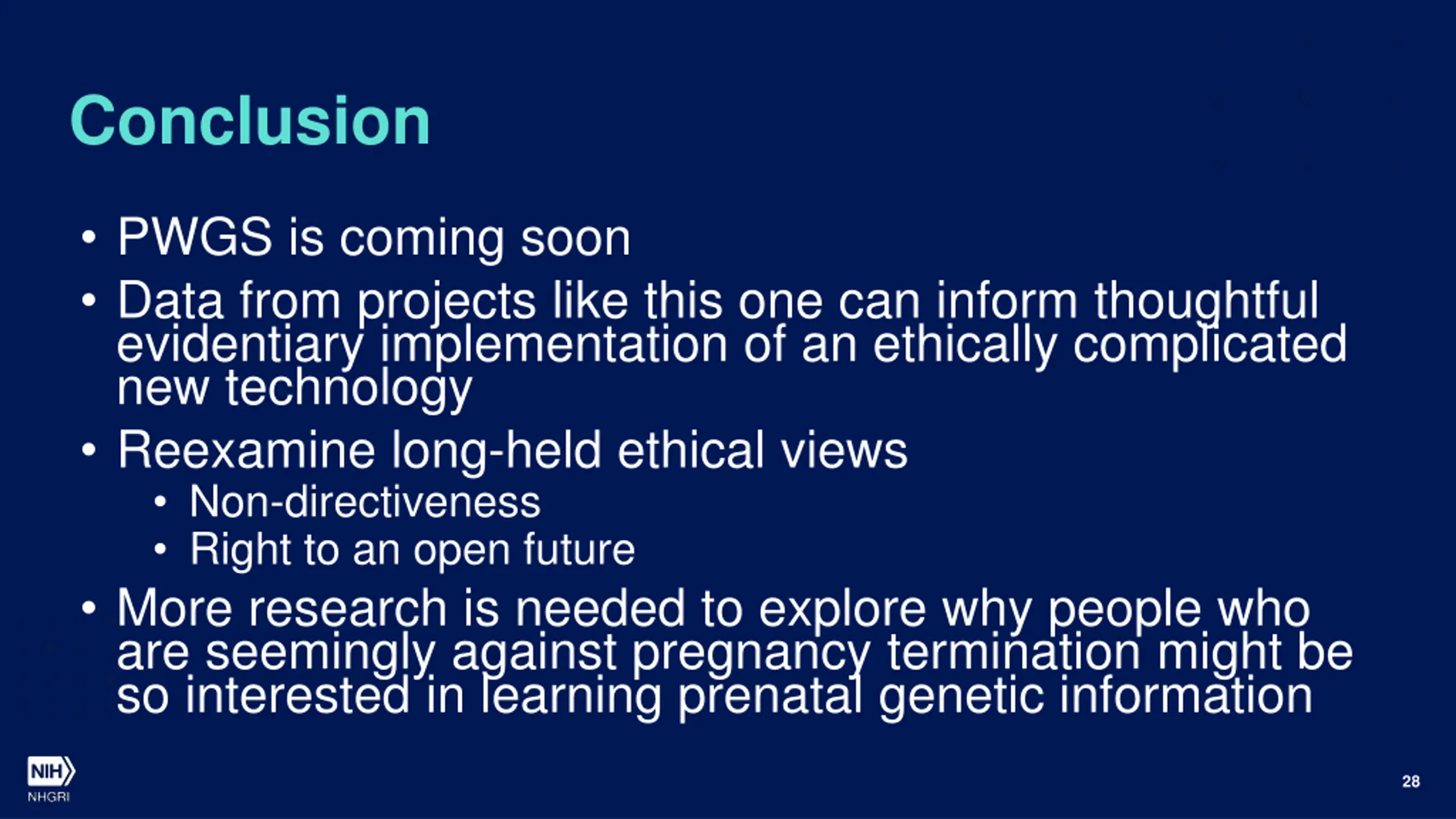 Conclusion PWGS is coming soon Data from projects like this one can inform thoughtful evidentiary implementation of an ethically complicated new technology Reexamine long-held ethical views Non-directiveness Right to an open future More research is needed to explore why people who are seemingly against pregnancy termination might be so interested in learning prenatal genetic information 28