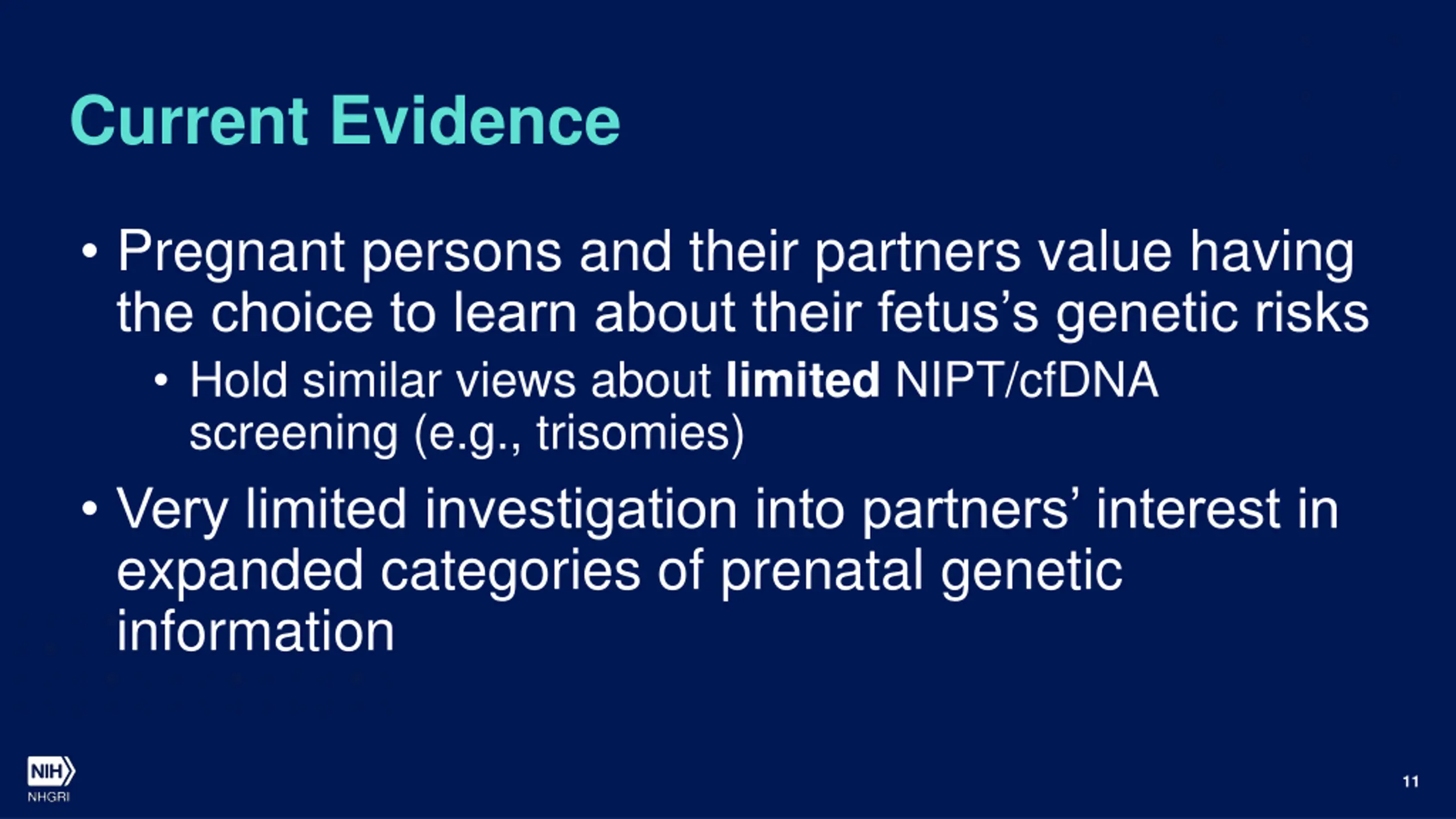 Current Evidence Pregnant persons and their partners value having the choice to learn about their fetus s genetic risks Hold similar views about limited NIPT/cfDNA screening (e.g., trisomies) Very limited investigation into partners interest in expanded categories of prenatal genetic information 11