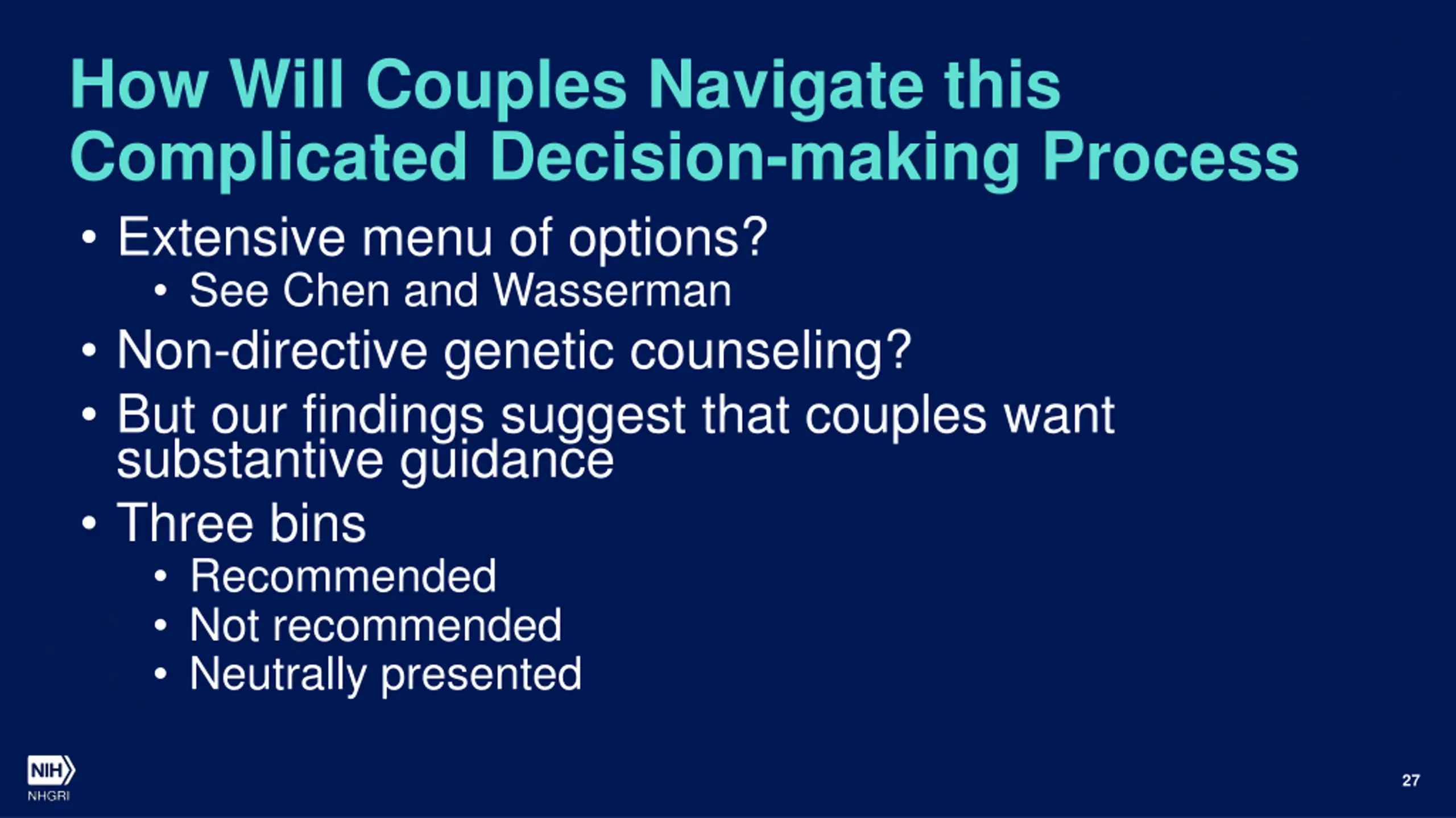 How Will Couples Navigate this Complicated Decision-making Process Extensive menu of options? See Chen and Wasserman Non-directive genetic counseling? But our findings suggest that couples want substantive guidance Three bins Recommended Not recommended Neutrally presented 27