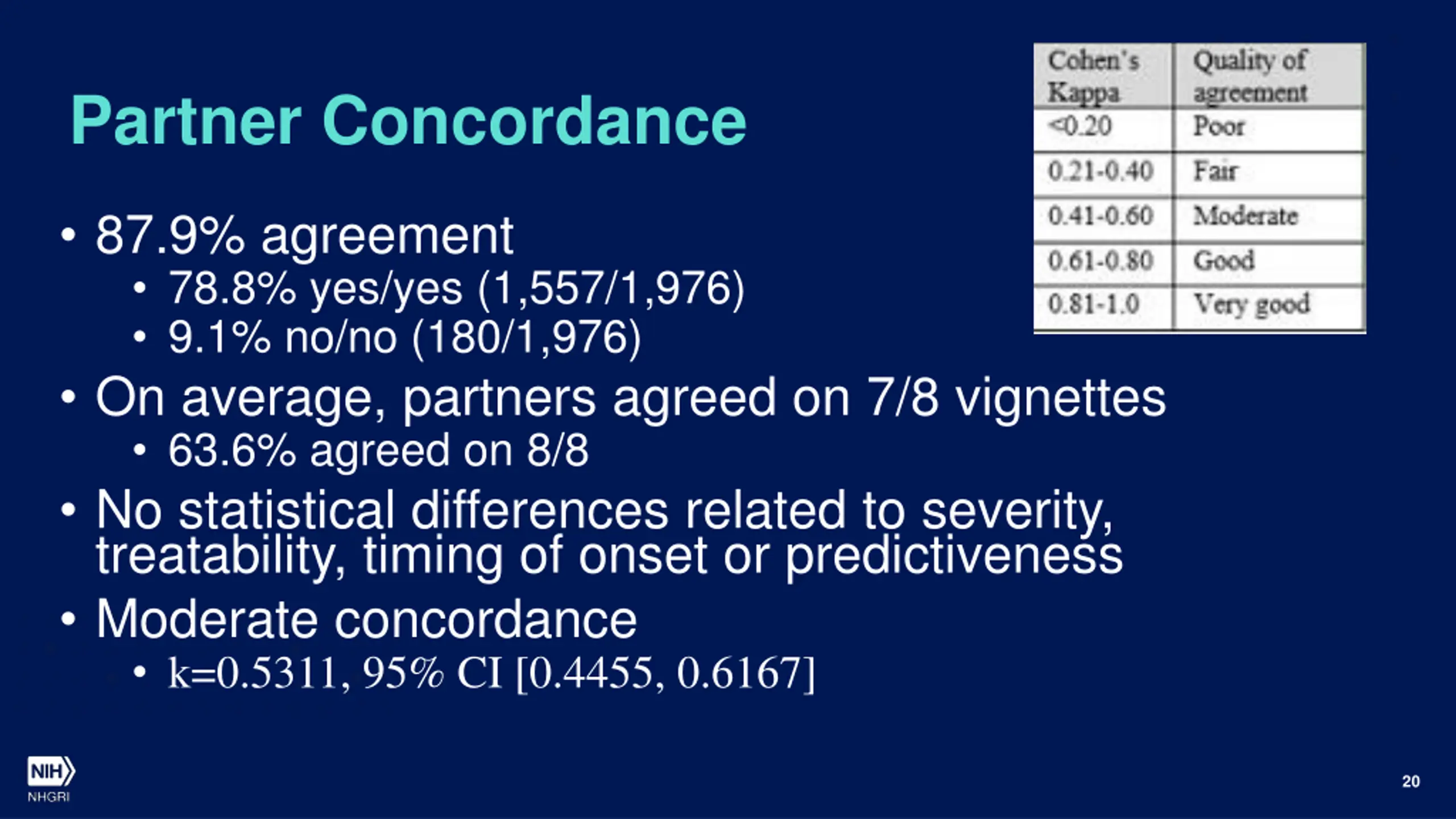 Partner Concordance 87.9% agreement 78.8% yes/yes (1,557/1,976) 9.1% no/no (180/1,976) On average, partners agreed on 7/8 vignettes 63.6% agreed on 8/8 No statistical differences related to severity, treatability, timing of onset or predictiveness Moderate concordance k=0.5311, 95% CI [0.4455, 0.6167] 20