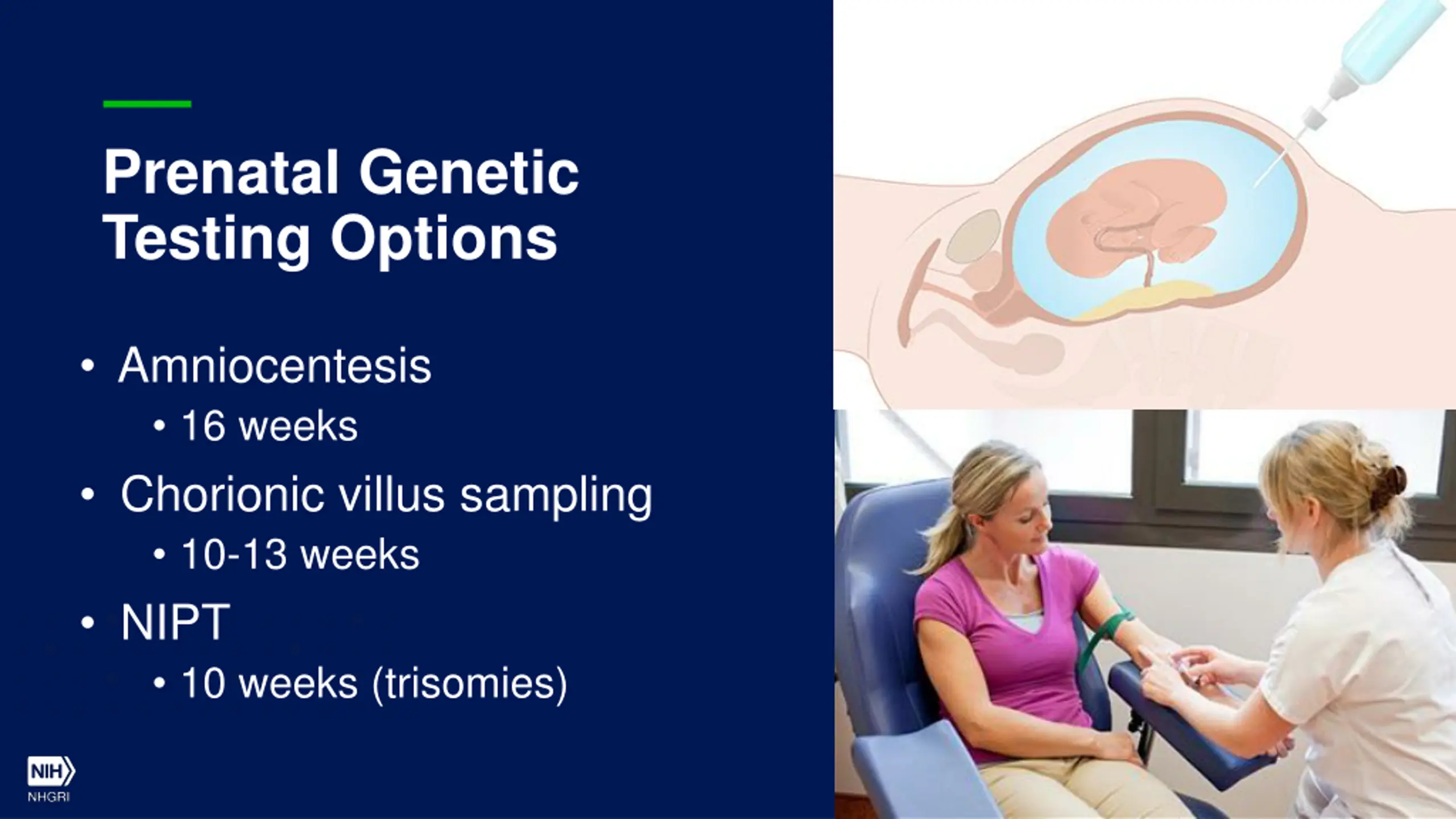 Prenatal Genetic Testing Options Amniocentesis 16 weeks Chorionic villus sampling 10-13 weeks NIPT 10 weeks (trisomies)