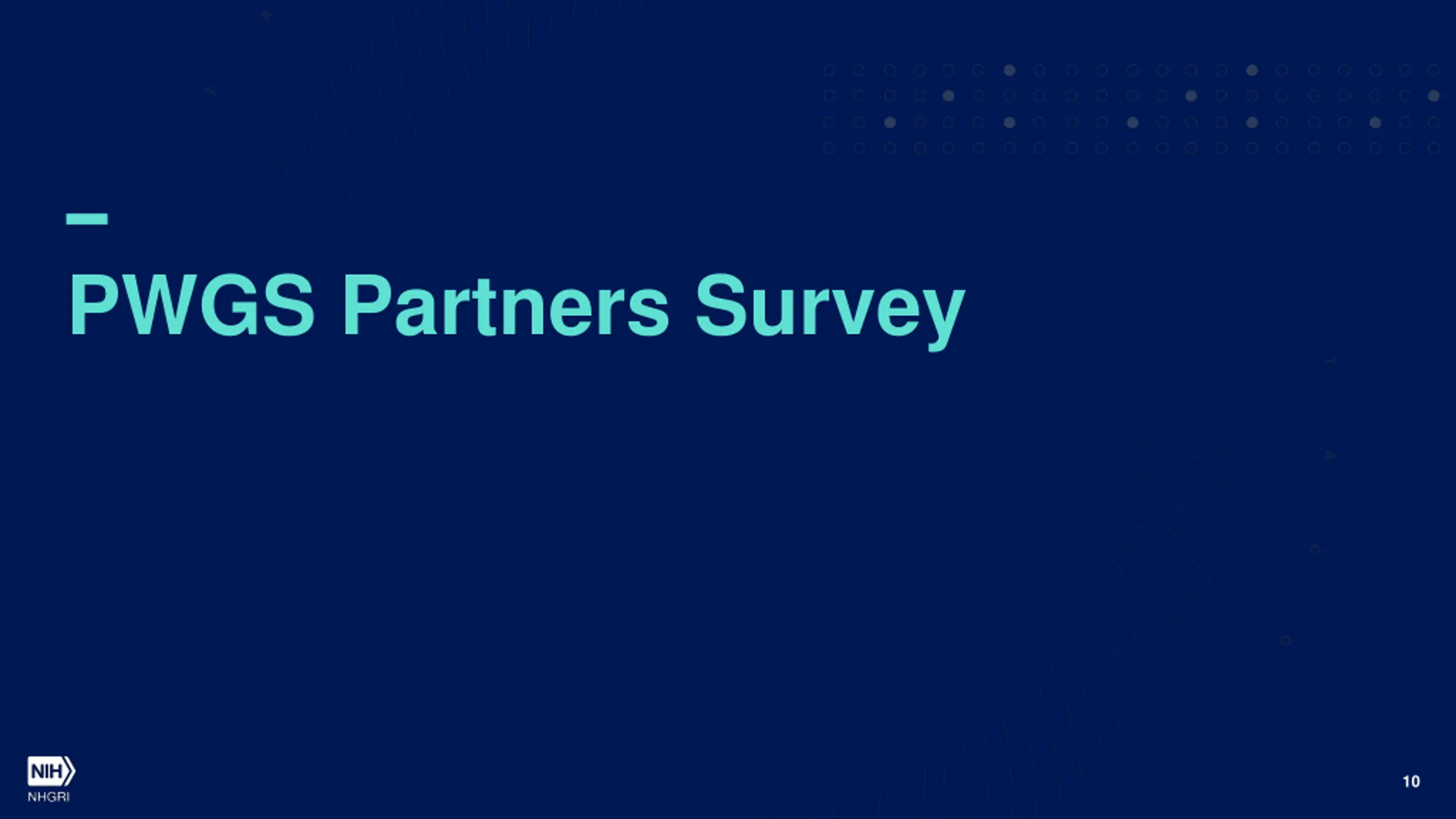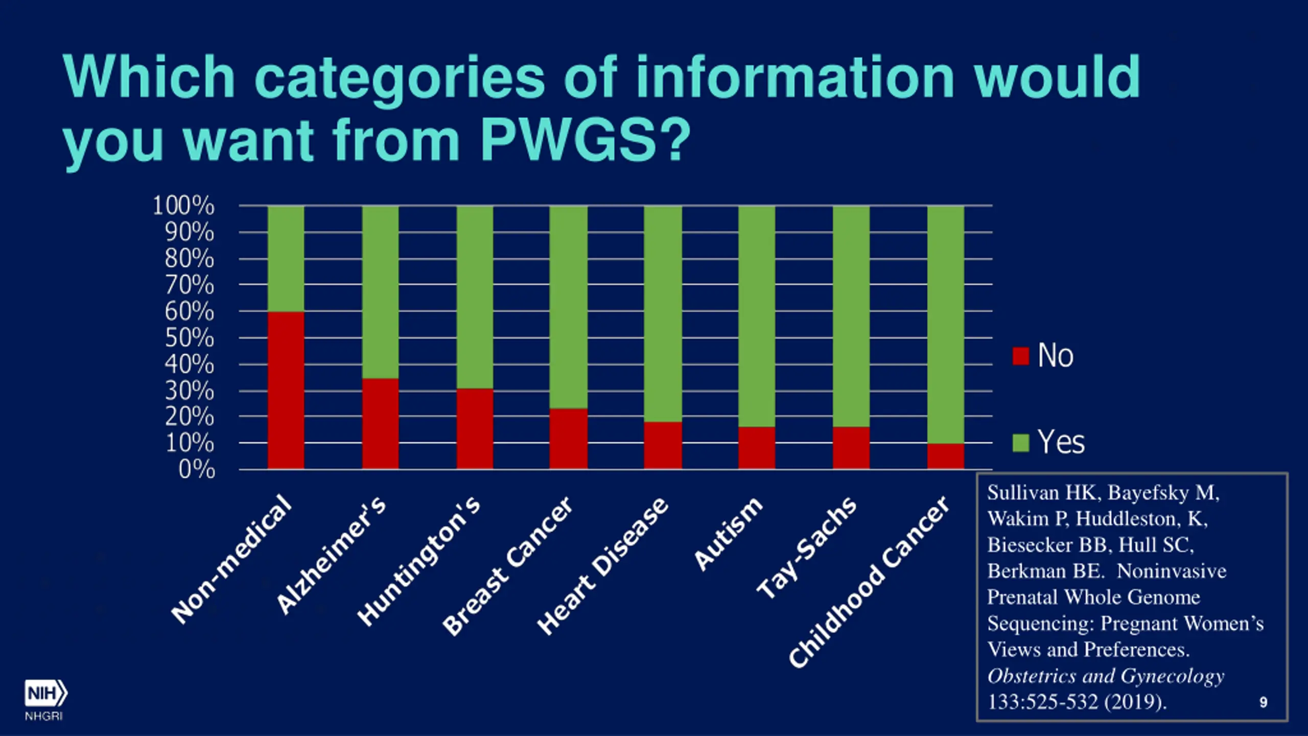 Which categories of information would you want from PWGS? Sullivan HK, Bayefsky M, Wakim P, Huddleston, K, Biesecker BB, Hull SC, BerkmanBE. Noninvasive Prenatal Whole Genome Sequencing: Pregnant Women s Views and Preferences. Obstetrics and Gynecology 133:525-532 (2019). 9