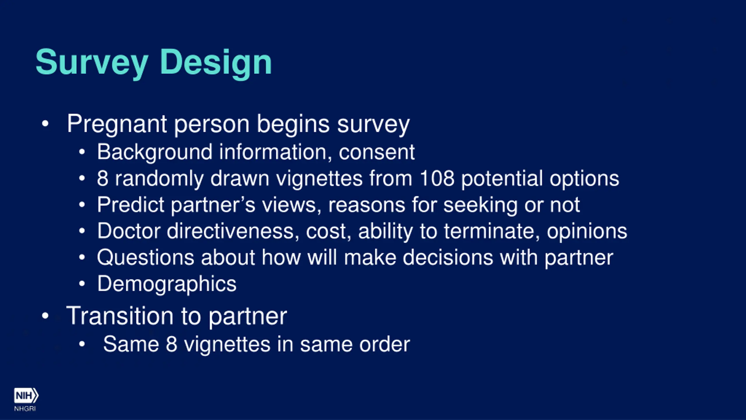 Survey Design Pregnant person begins survey Background information, consent 8 randomly drawn vignettes from 108 potential options Predict partner s views, reasons for seeking or not Doctor directiveness, cost, ability to terminate, opinions Questions about how will make decisions with partner Demographics Transition to partner Same 8 vignettes in same order