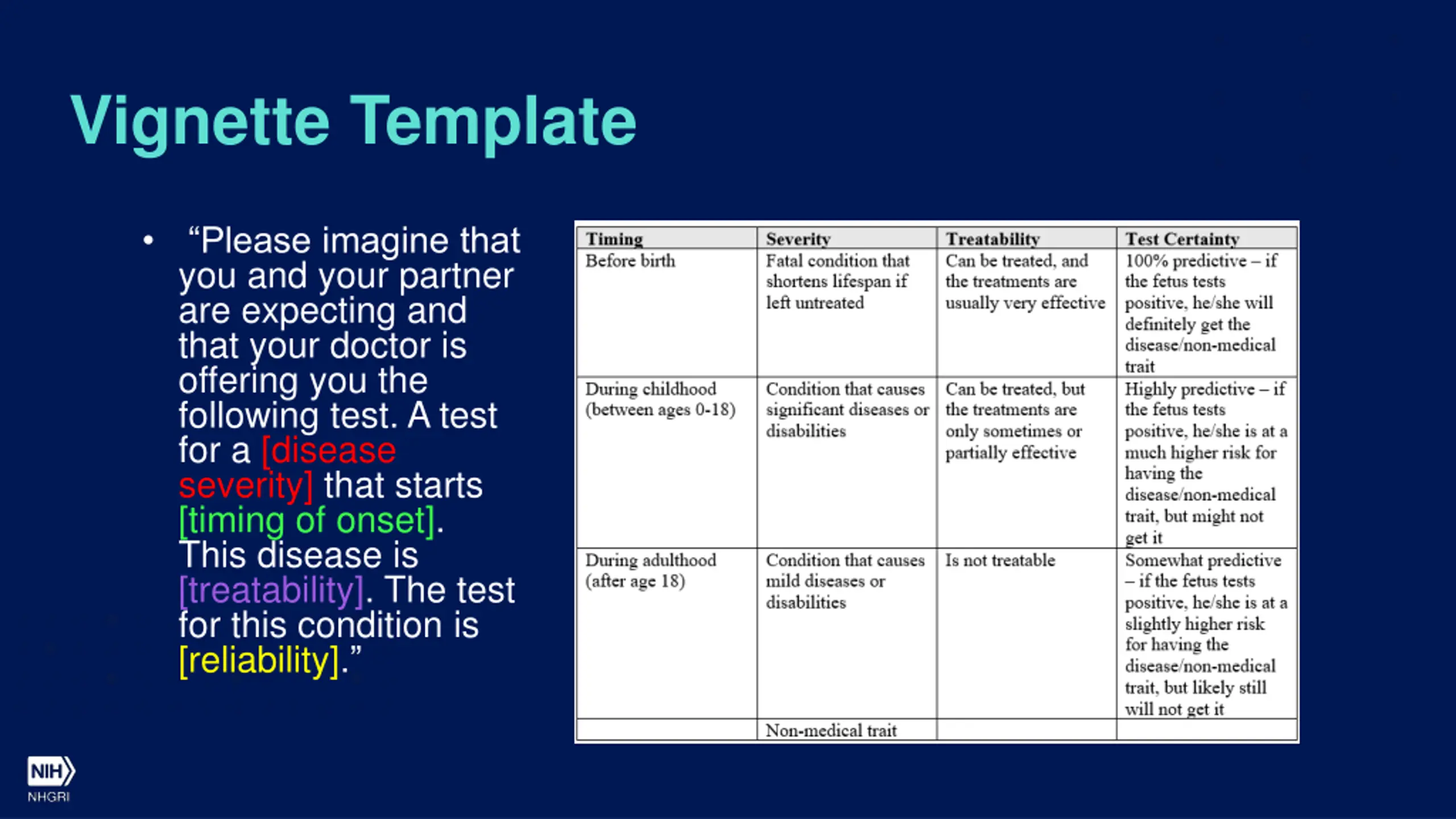 Vignette Template Please imagine that you and your partner are expecting and that your doctor is offering you the following test. A test for a [disease severity] that starts [timing of onset]. This disease is [treatability]. The test for this condition is [reliability].