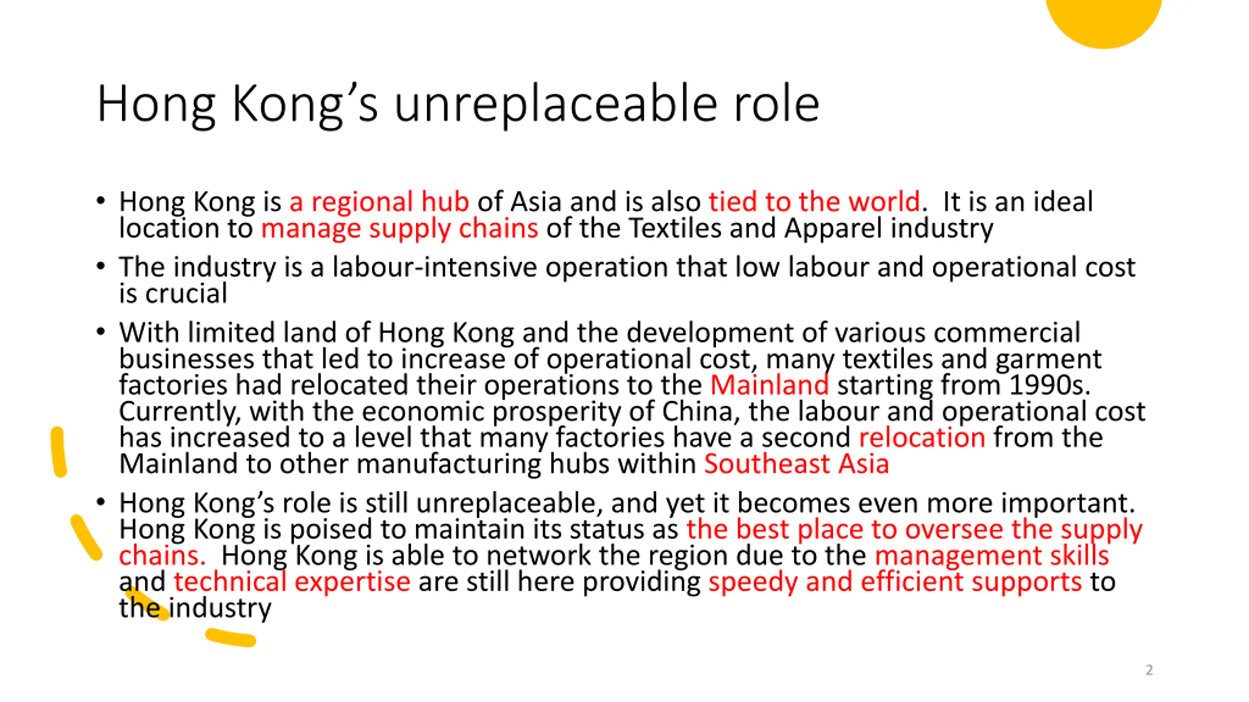 Hong Kongs unreplaceable role Hong Kong is a regional hub of Asia and is also tied to the world. It is an ideal location to manage supply chains of the Textiles and Apparel industry The industry is a labour-intensive operation that low labour and operational cost is crucial With limited land of Hong Kong and the development of various commercial businesses that led to increase of operational cost, many textiles and garment factories had relocated their operations to the Mainland starting from 1990s. Currently, with the economic prosperity of China, the labour and operational cost has increased to a level that many factories have a second relocation from the Mainland to other manufacturing hubs within Southeast Asia Hong Kong s role is still unreplaceable, and yet it becomes even more important. Hong Kong is poised to maintain its status as the best place to oversee the supply chains. Hong Kong is able to network the region due to the management skills and technical expertise are still here providing speedy and efficient supports to the industry 2