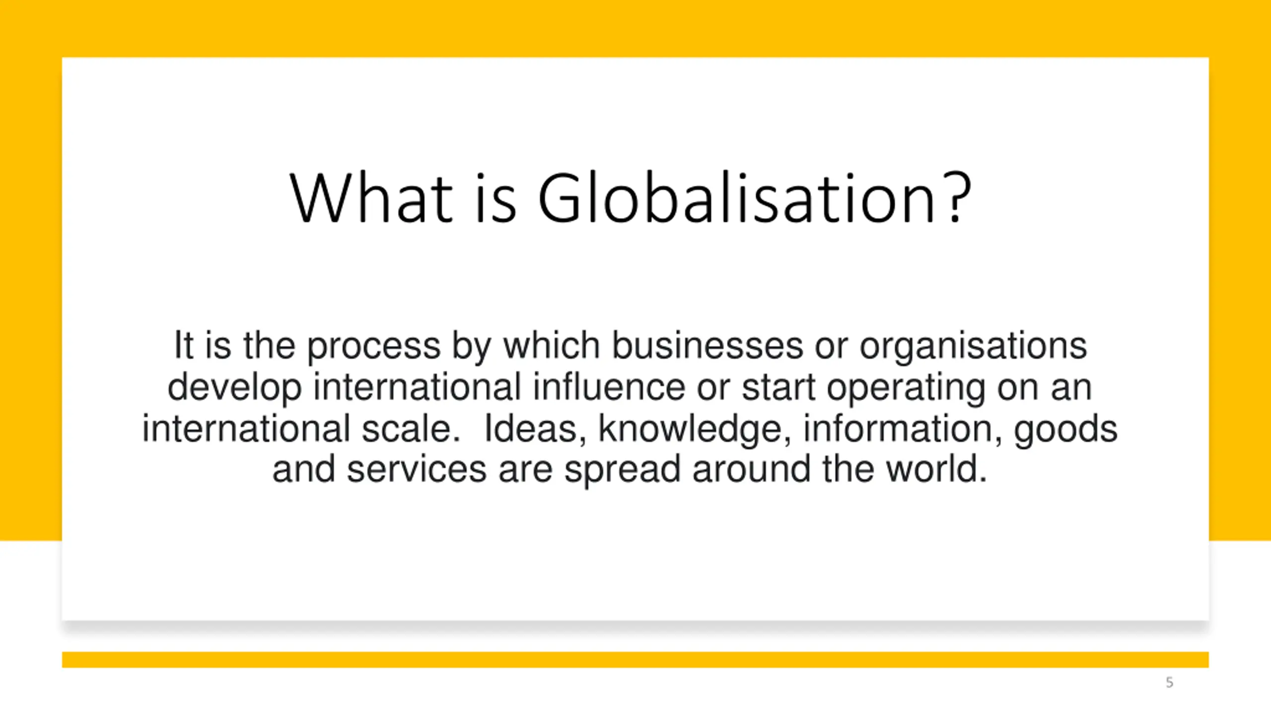 What is Globalisation? It is the process by which businesses or organisations develop international influence or start operating on an international scale. Ideas, knowledge, information, goods and services are spread around the world. 5
