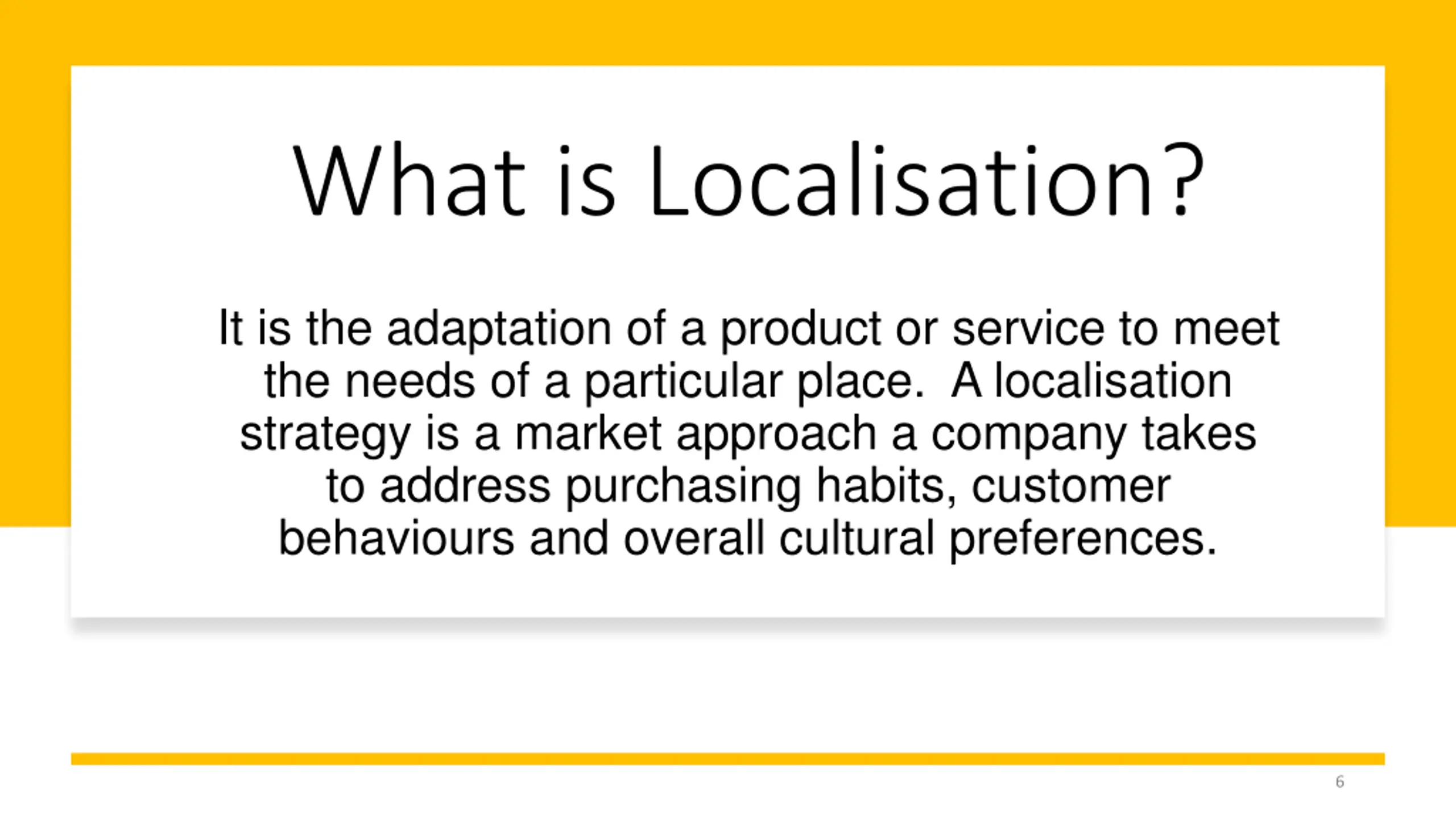 What is Localisation? It is the adaptation of a product or service to meet the needs of a particular place. A localisation strategy is a market approach a company takes to address purchasing habits, customer behaviours and overall cultural preferences. 6
