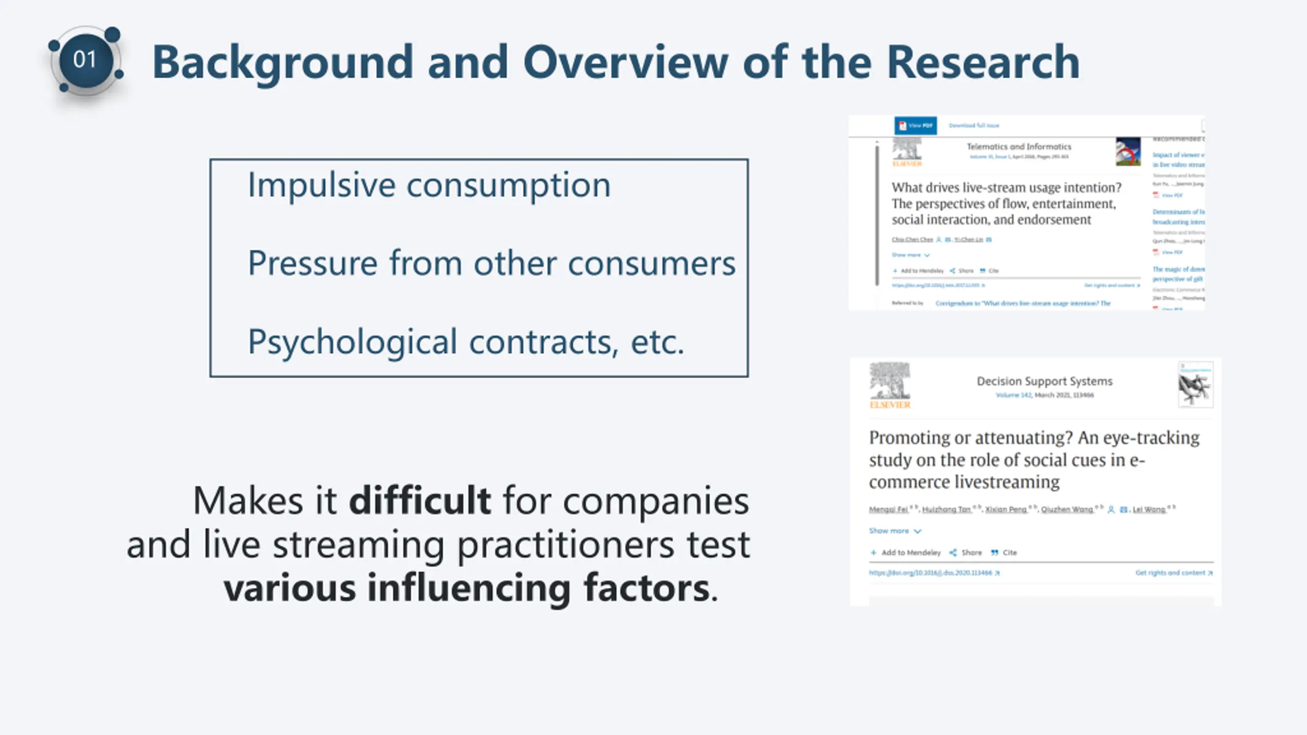 Background and Overview of the Research 01 Impulsive consumption Pressure from other consumers Psychological contracts, etc. Makes it difficult for companies and live streaming practitioners test various influencing factors.
