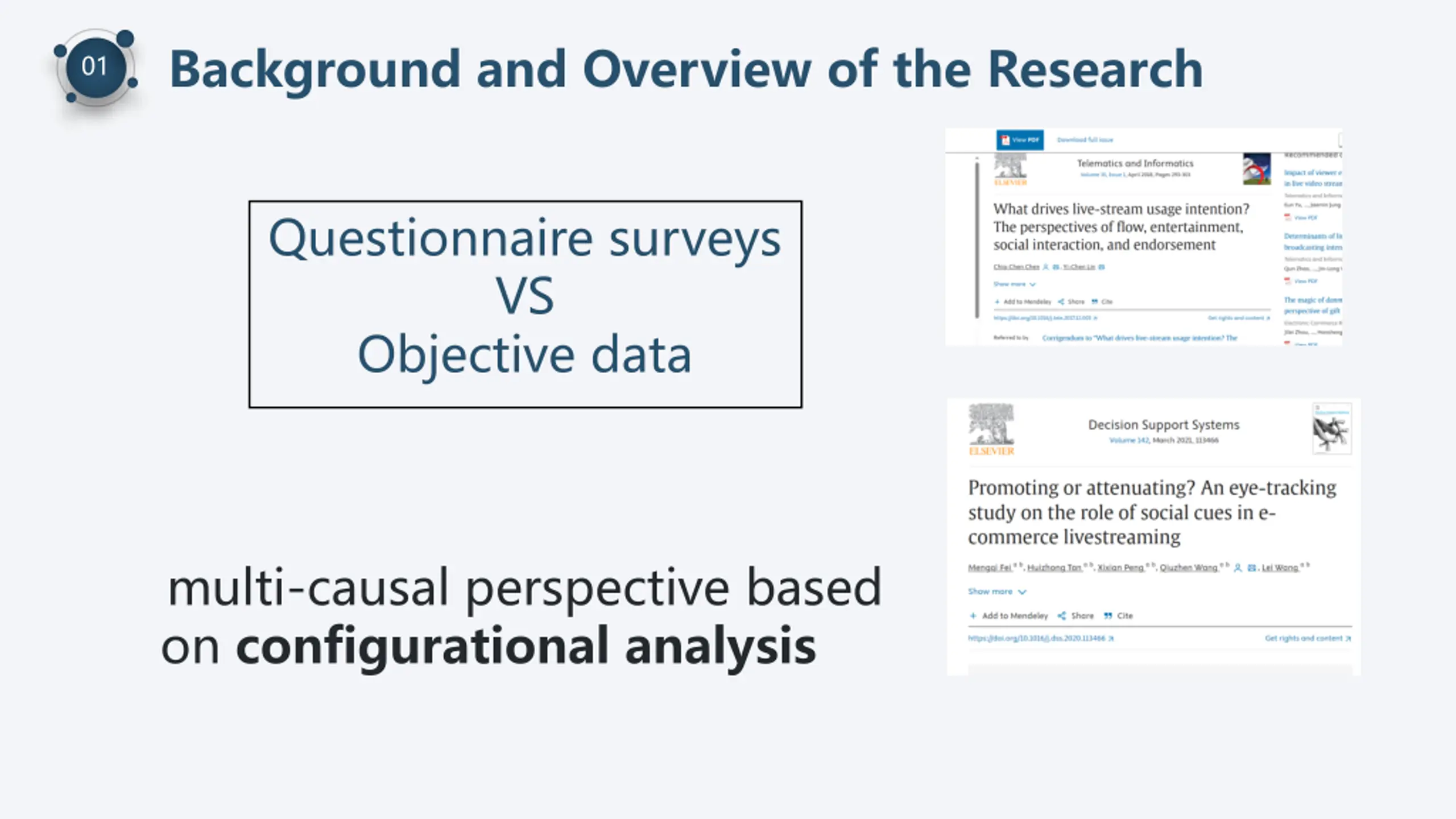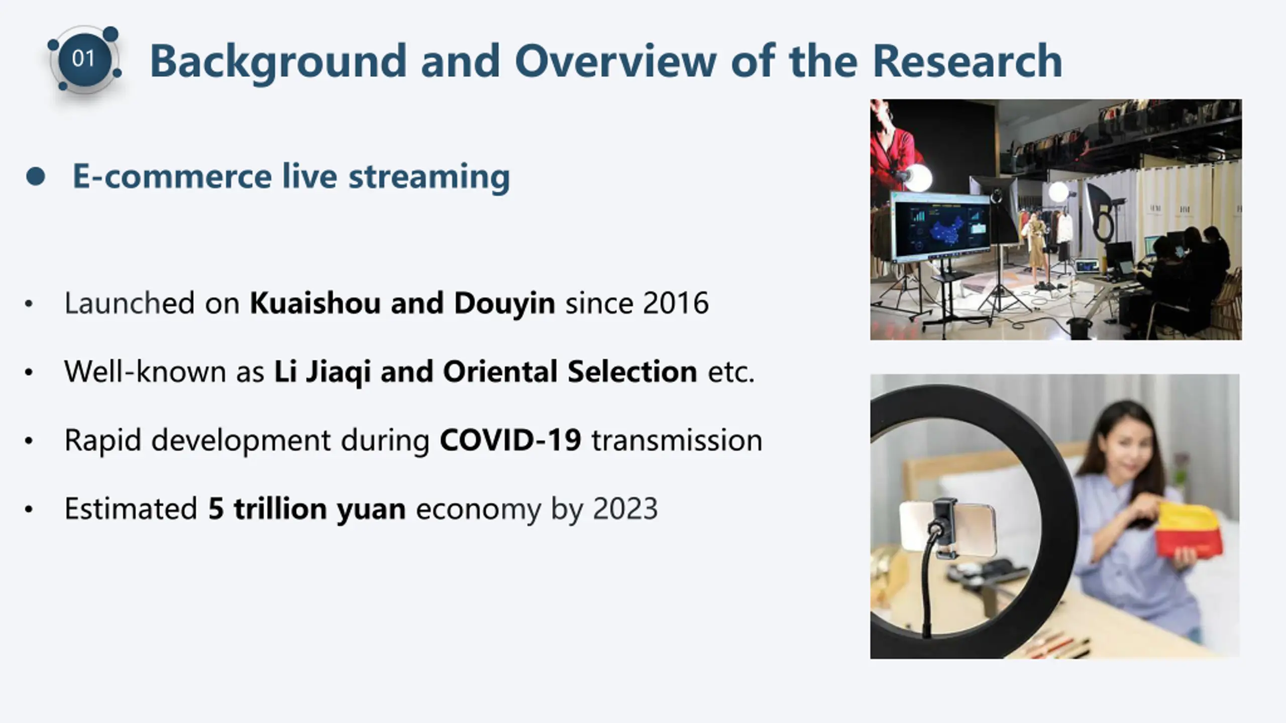 Background and Overview of the Research 01 E-commerce live streaming Launched on Kuaishou and Douyin since 2016 Well-known as Li Jiaqi and Oriental Selection etc. Rapid development during COVID-19 transmission Estimated 5 trillion yuan economy by 2023