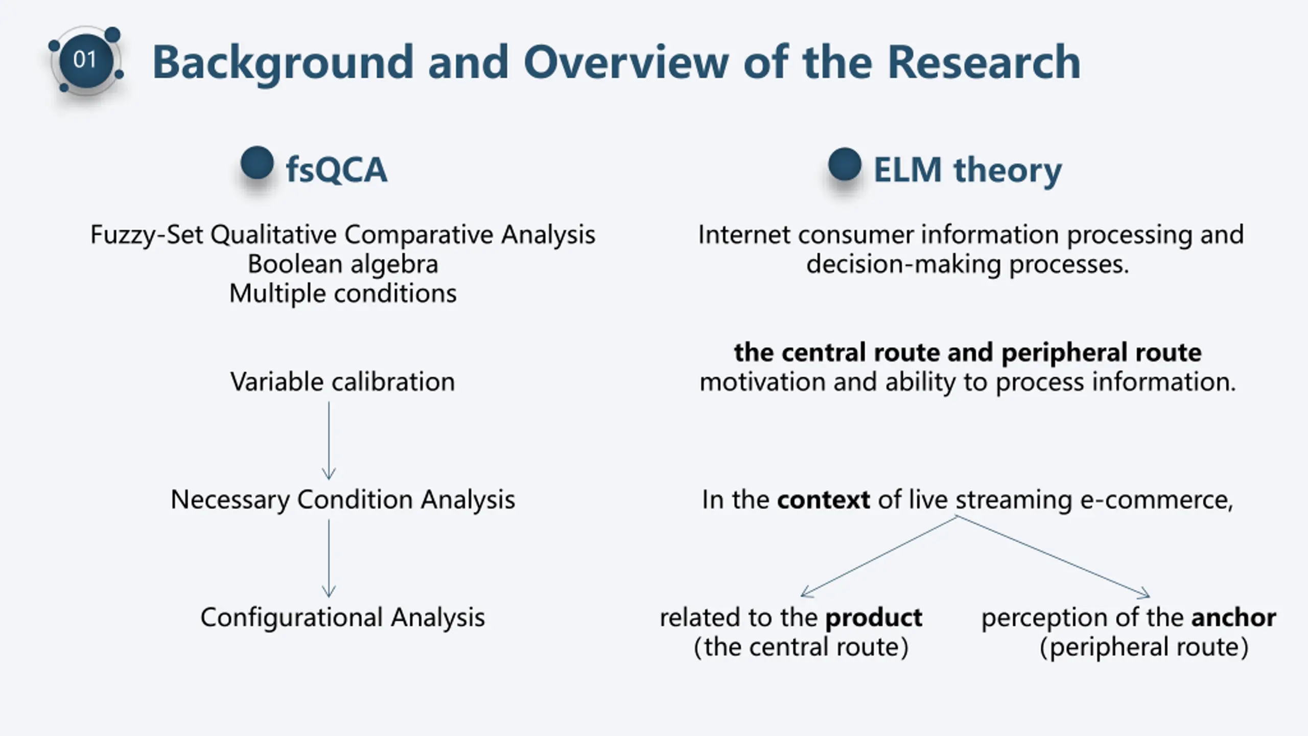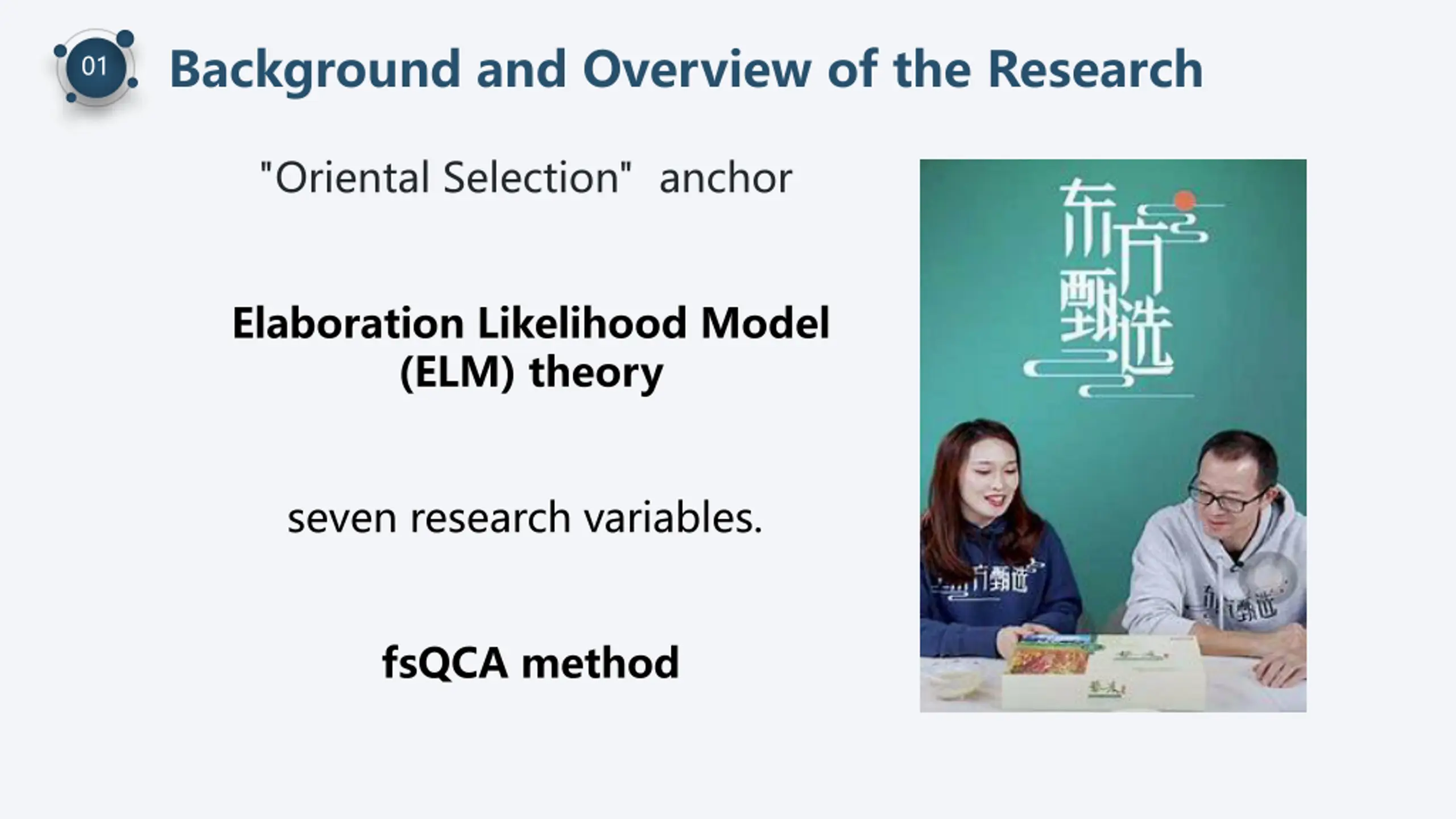 Background and Overview of the Research 01 "Oriental Selection" anchor Elaboration Likelihood Model (ELM) theory seven research variables. fsQCA method