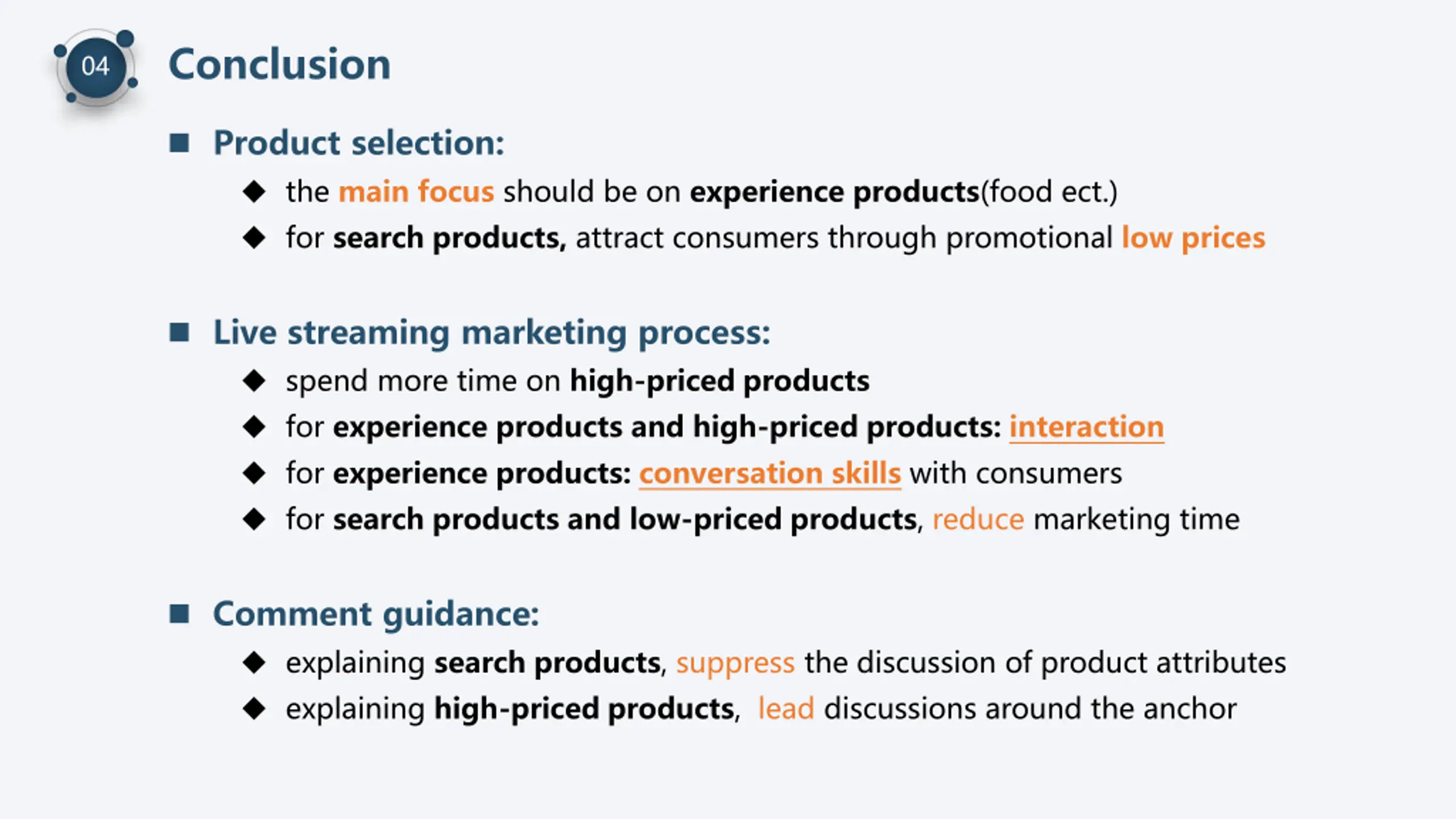 Conclusion 04 Product selection: the main focus should be on experience products(food ect.) for search products, attract consumers through promotional low prices Live streaming marketing process: spend more time on high-priced products for experience products and high-priced products: interaction for experience products: conversation skills with consumers for search products and low-priced products, reduce marketing time Comment guidance: explaining search products, suppress the discussion of product attributes explaining high-priced products, lead discussions around the anchor