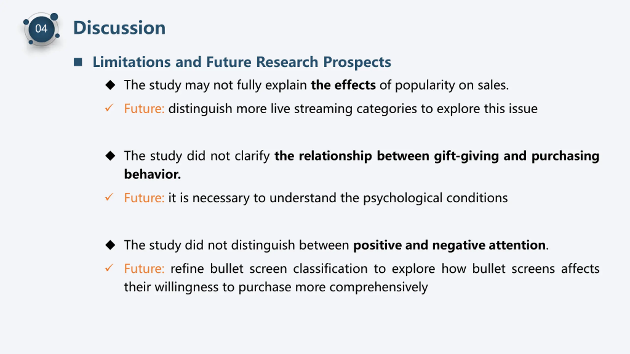 Discussion 04 Limitations and Future Research Prospects The study may not fully explain the effects of popularity on sales. Future: distinguish more live streaming categories to explore this issue The study did not clarify the relationship between gift-giving and purchasing behavior. Future: it is necessary to understand the psychological conditions The study did not distinguish between positive and negative attention. Future: refine bullet screen classification to explore how bullet screens affects their willingness to purchase more comprehensively