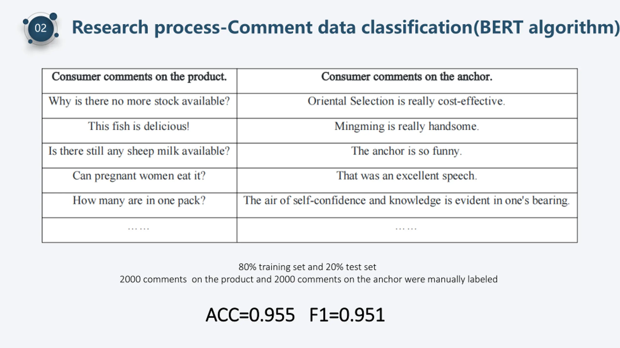 Research process-Comment data classification(BERT algorithm) 02 80% training set and 20% test set 2000 comments on the product and 2000 comments on the anchor were manually labeled ACC ACC=0.955 =0.955 F F1=0.951 1=0.951