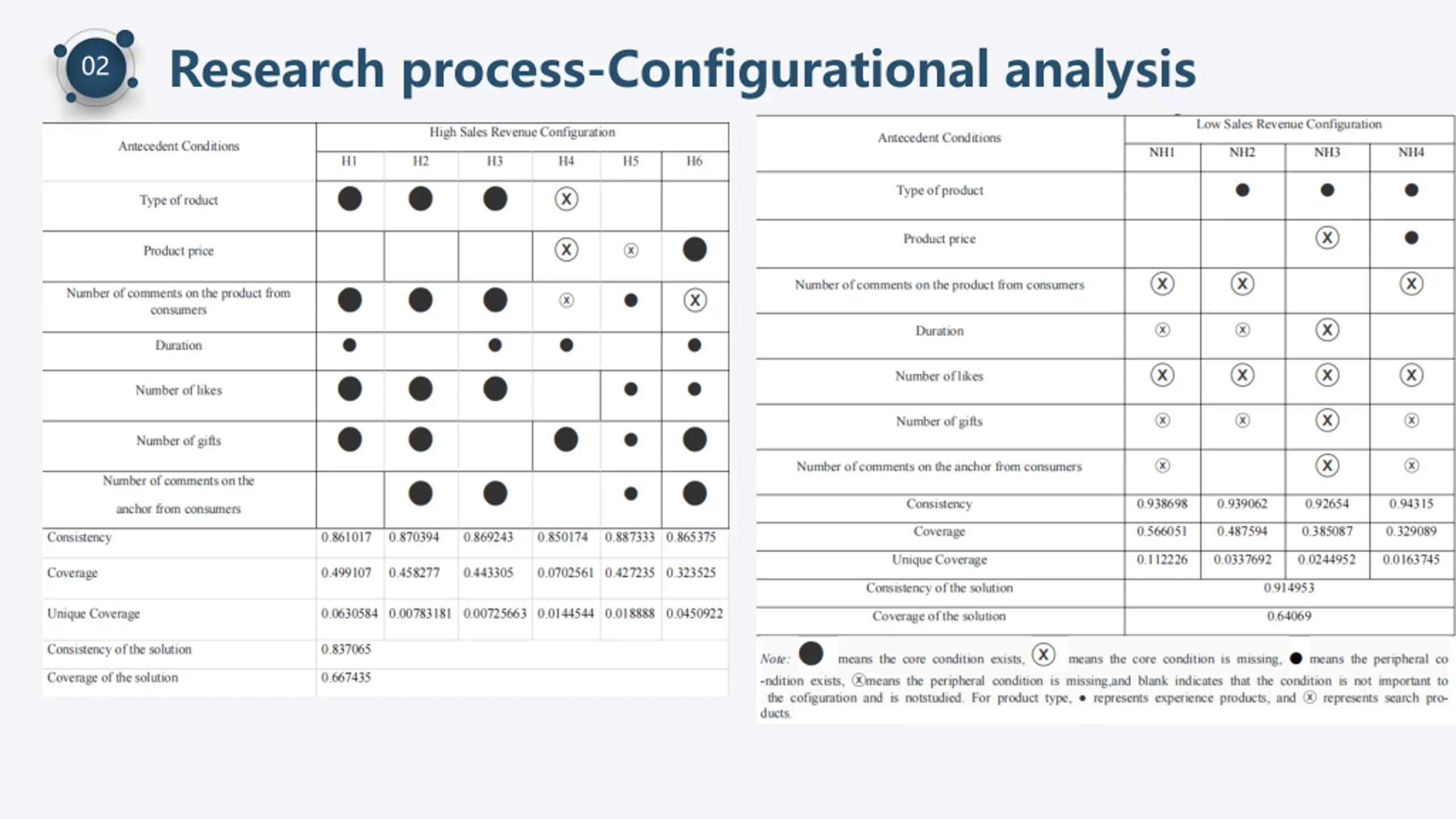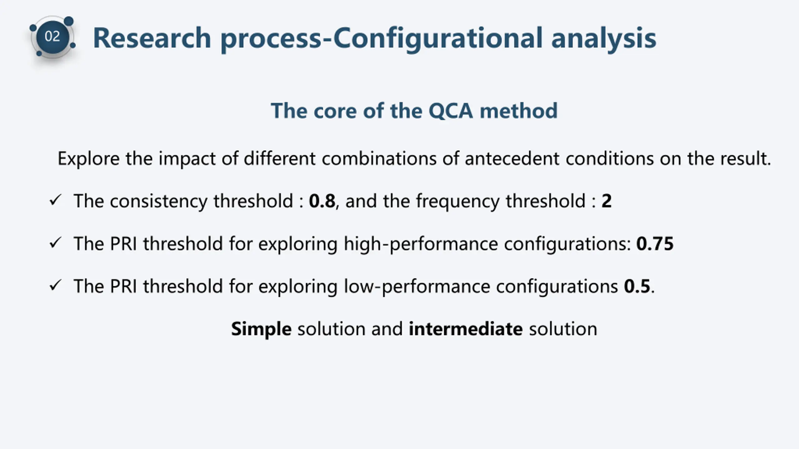Research process-Configurational analysis 02 The core of the QCA method Explore the impact of different combinations of antecedent conditions on the result. The consistency threshold : 0.8, and the frequency threshold : 2 The PRI threshold for exploring high-performance configurations: 0.75 The PRI threshold for exploring low-performance configurations 0.5. Simple solution and intermediate solution
