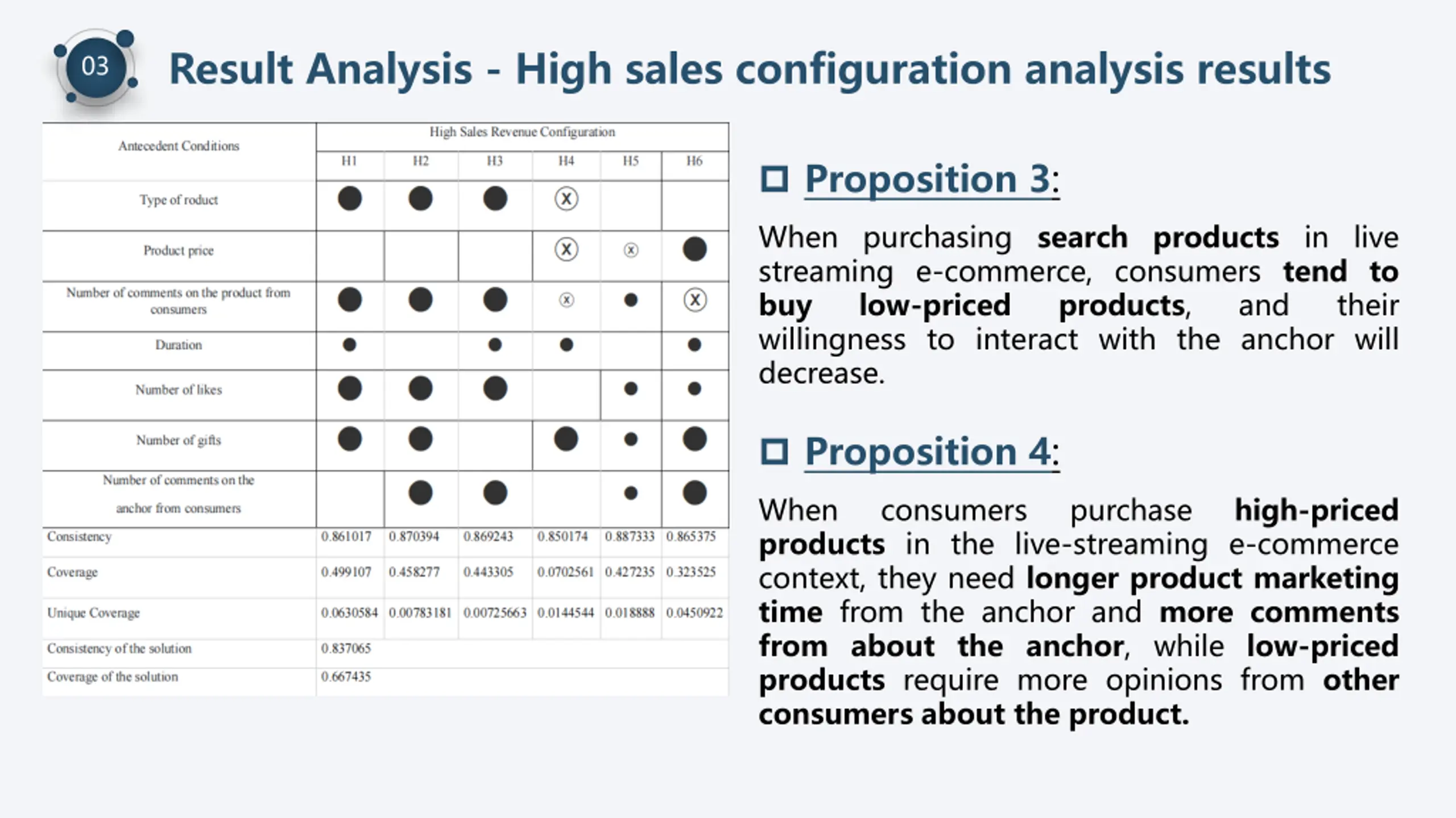 Result Analysis - High sales configuration analysis results 03 Proposition 3: When purchasing search products in live streaming e-commerce, consumers tend to buy low-priced products, willingness to interact with the anchor will decrease. and their Proposition 4: When products in the live-streaming e-commerce context, they need longer product marketing time from the anchor and more comments from about the anchor, while low-priced products require more opinions from other consumers about the product. consumers purchase high-priced