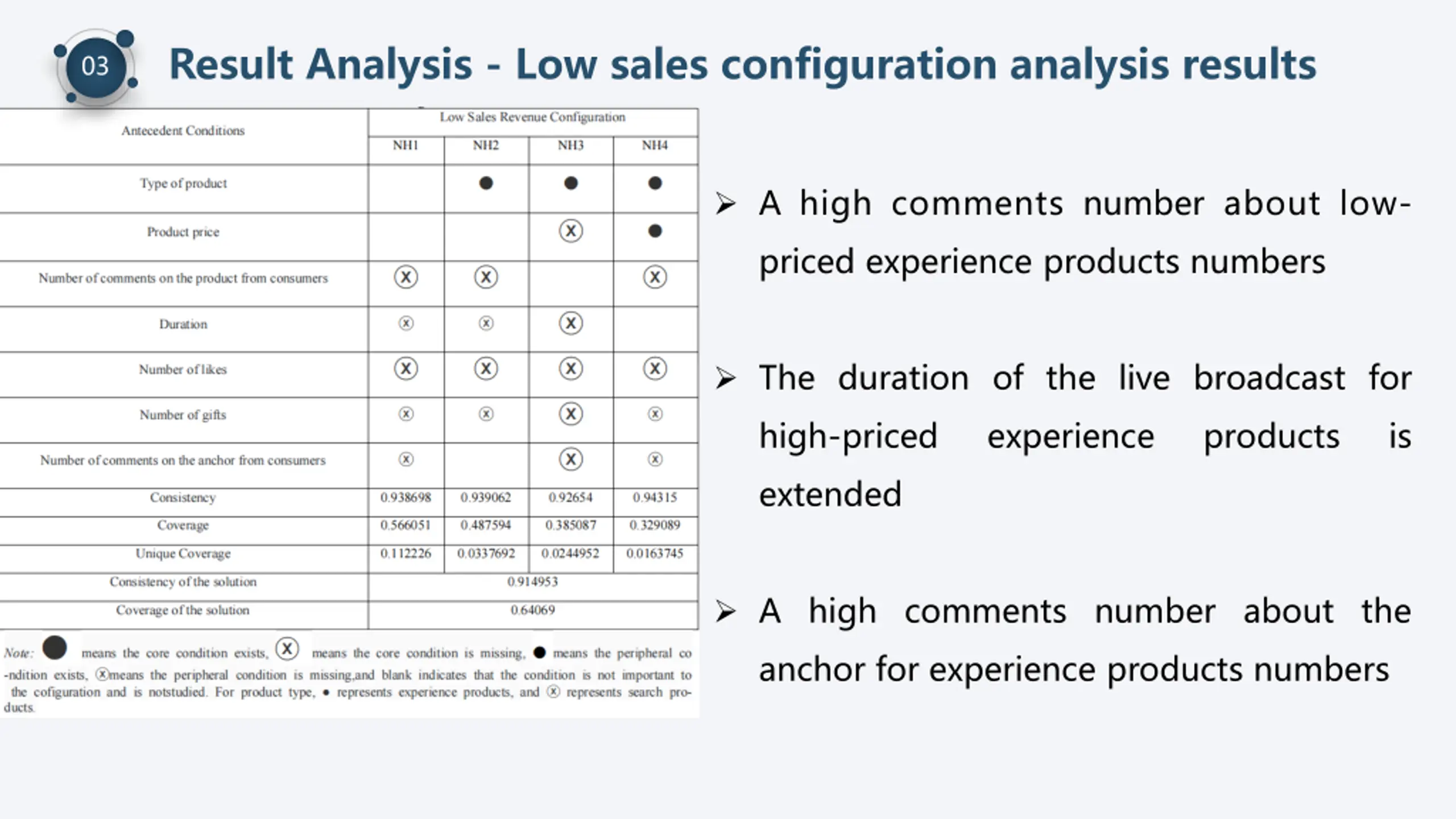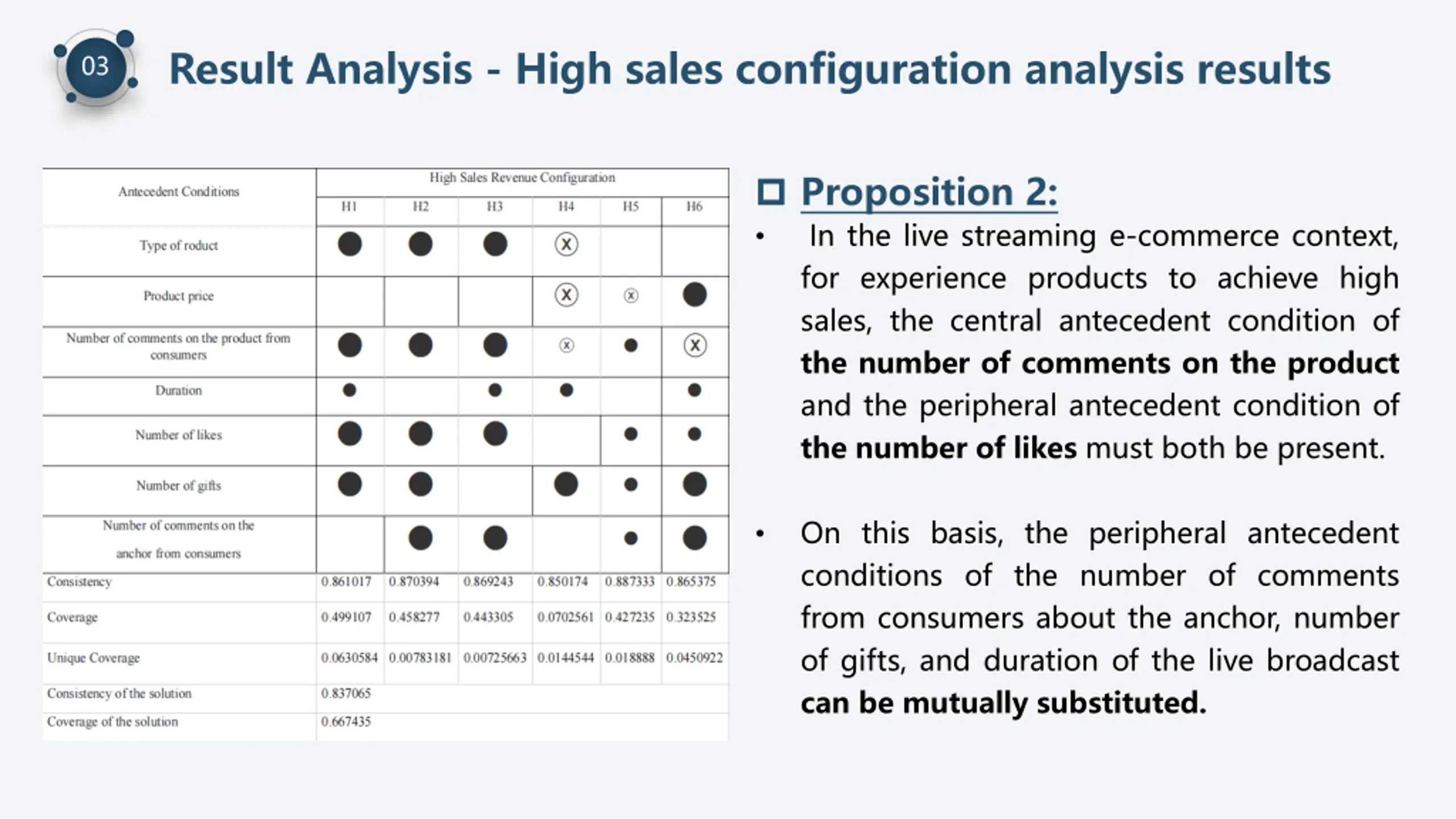 Result Analysis - High sales configuration analysis results 03 Proposition 2: In the live streaming e-commerce context, for experience products to achieve high sales, the central antecedent condition of the number of comments on the product and the peripheral antecedent condition of the number of likes must both be present. On this basis, the peripheral antecedent conditions of the number of comments from consumers about the anchor, number of gifts, and duration of the live broadcast can be mutually substituted.