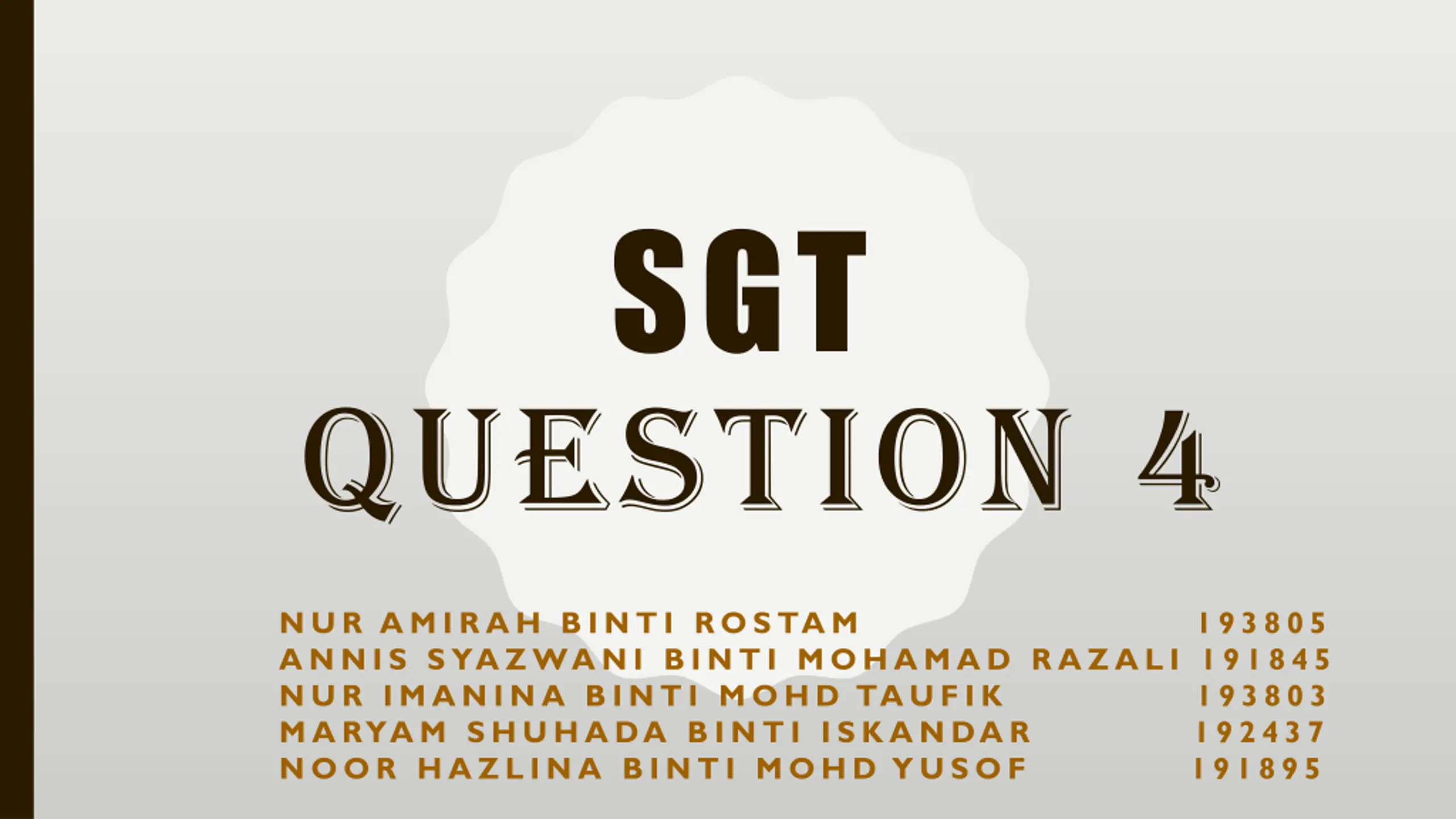 SGT QUESTION 4 N UR A M I R A H BI N TI ROS TA M A N N I S S YA ZWA N I BI N TI M OHA M A D R A ZA LI 1 9 1 8 4 5 N UR I M A N I N A BI N TI M OHD TAUF I K M A RYA M S HUHA DA BI N T I I S KA N DA R 192437 N OOR HA ZLI N A BI N TI M OHD Y US OF 1 9 3 8 0 5 1 9 3 8 0 3 1 9 1 8 9 5